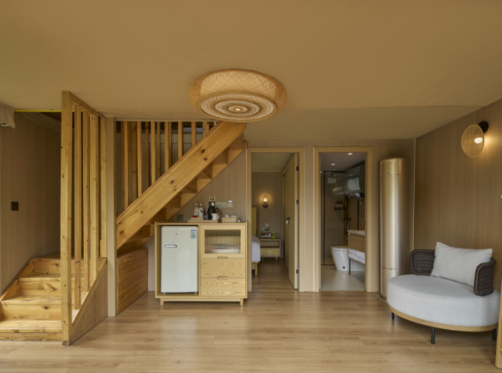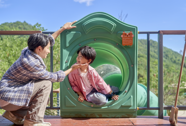 80栋独栋帐篷散落在山谷间,空调地暖双配齐,独立卫浴+高支棉床品,完全颠覆“露营=吃苦”的刻板印象。家庭房自带室外滑梯,儿童洗漱用品一应俱全,24小时管家随叫随到,带娃党真的可以直接闭眼冲。