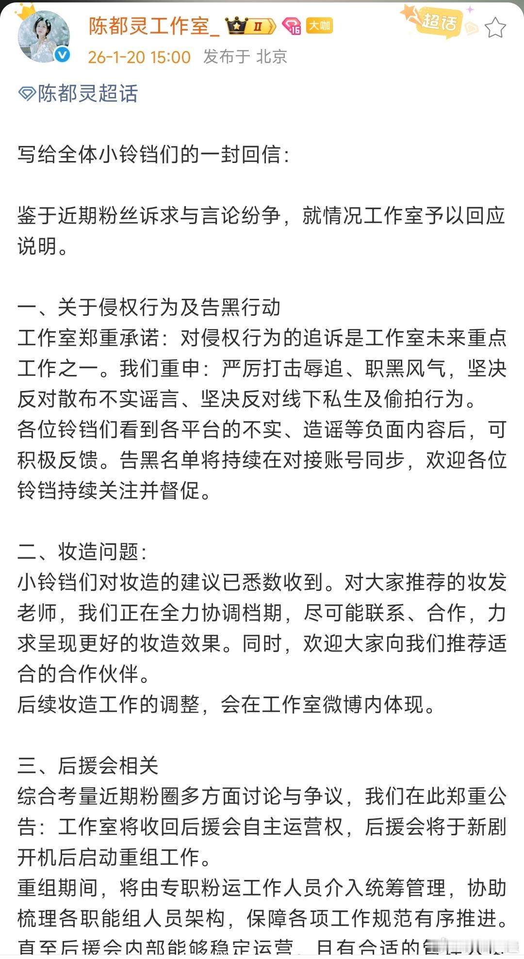 陈都灵方回应粉丝诉求陈都灵工作室回信 嗯嗯