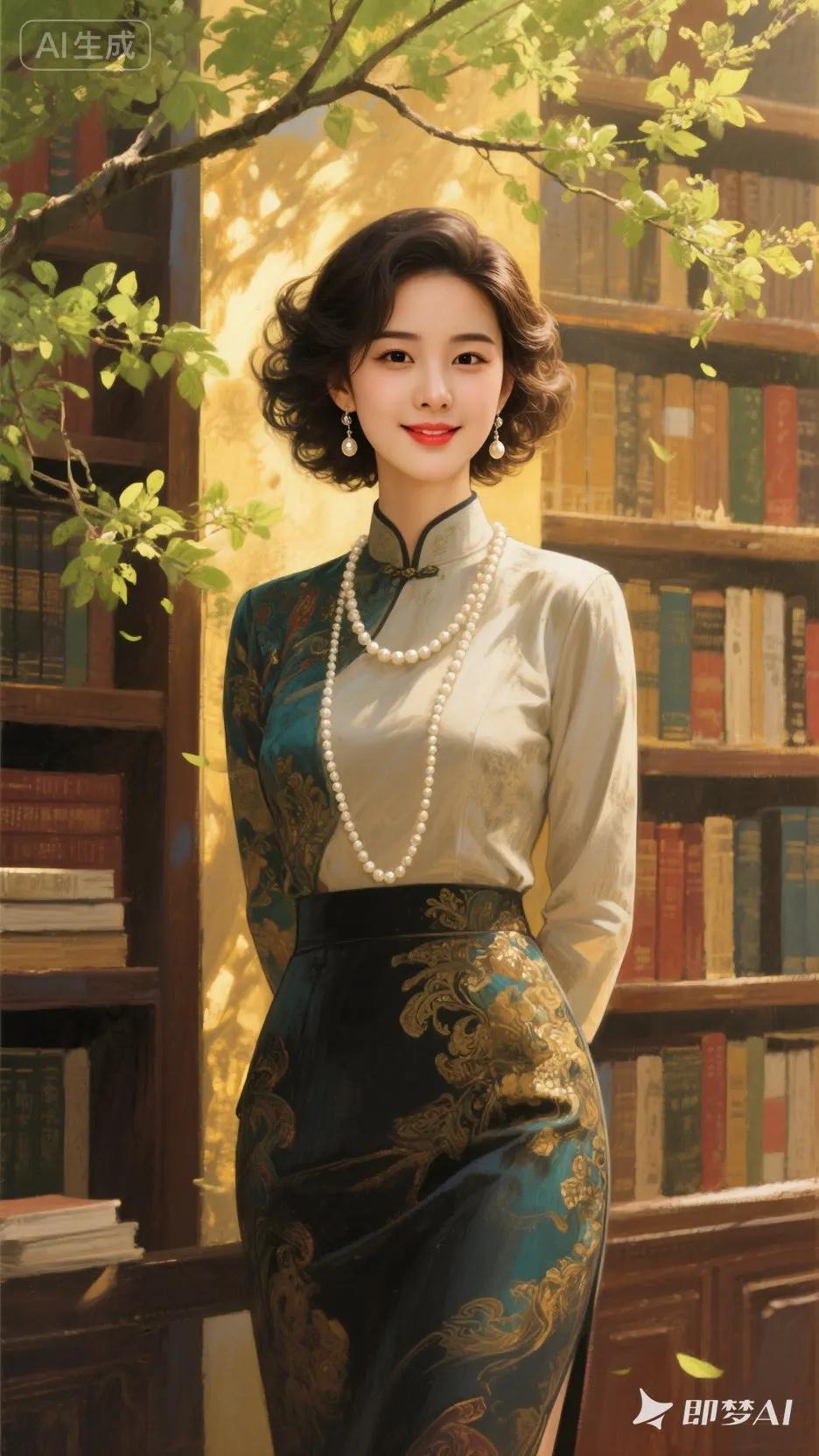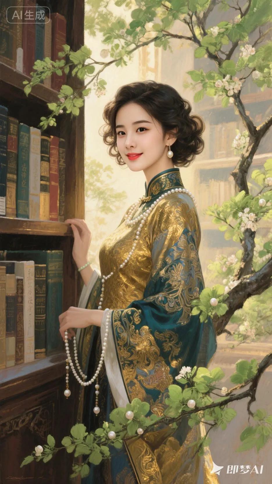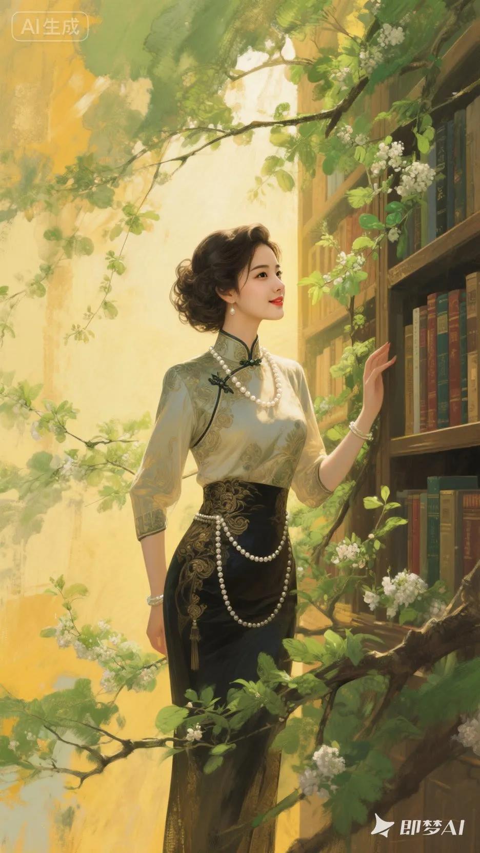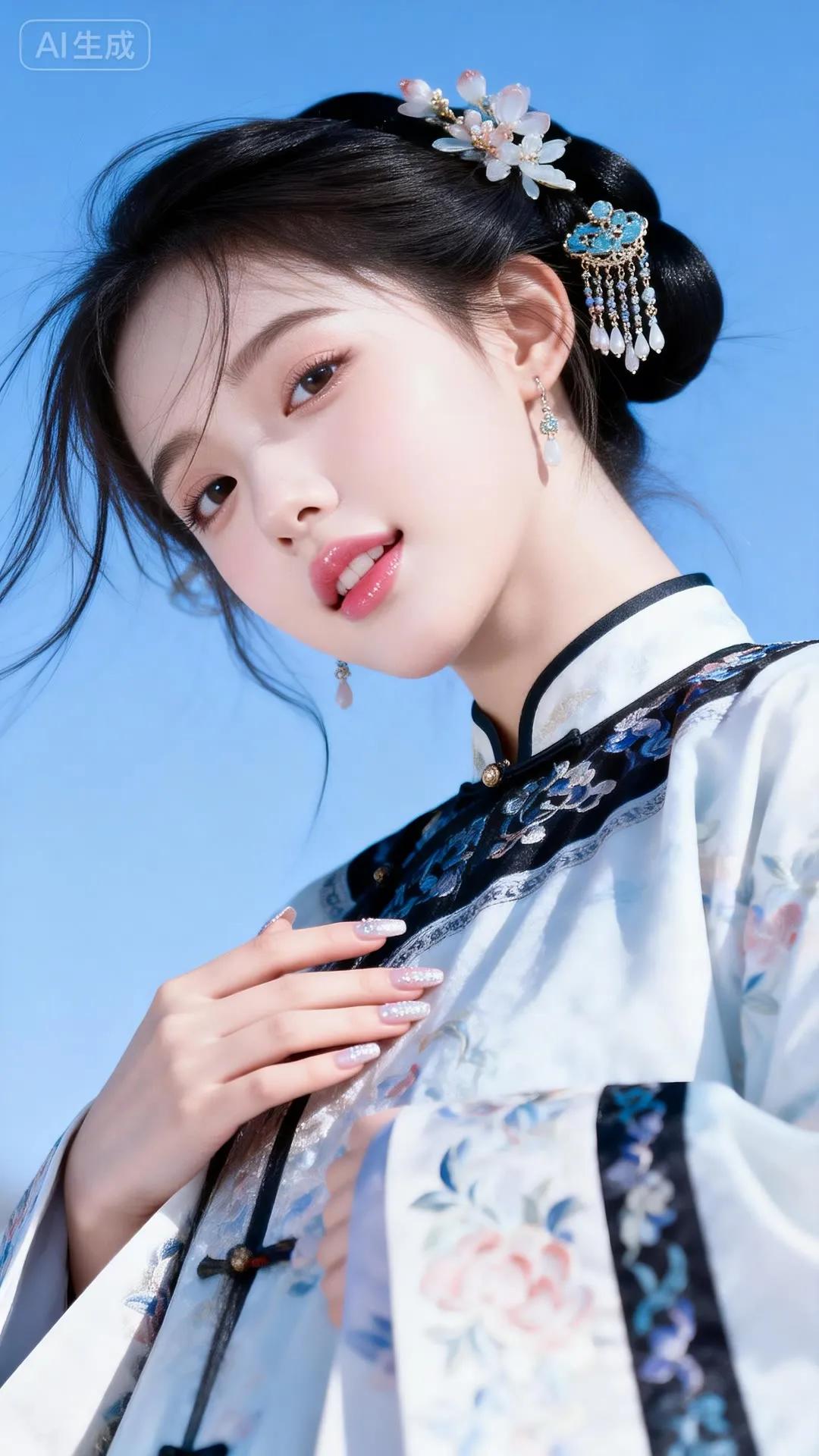 古典美人,蓝白相间汉服,优雅坐于绿树旁。