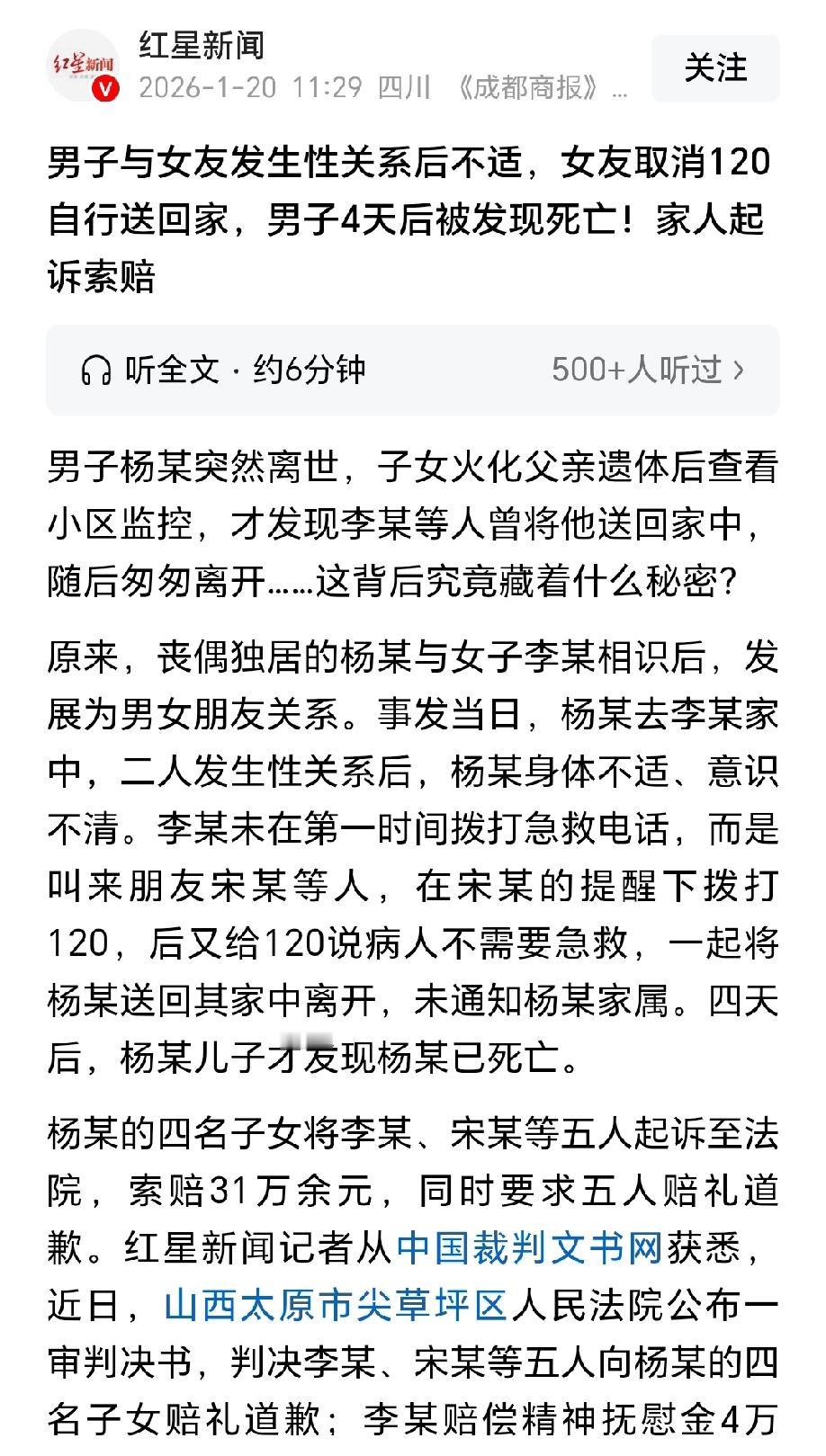 山西太原,独居男子在女友家中一番云雨后,突发身体不适,失去了意识。女子吓得不知所措,赶紧给几个朋友打电话求助,朋友建议女子赶紧拨打120进行急救。可电话刚打完女子就后悔了,担心救护车的动静闹的人尽皆知,于是又谎称人已清醒,取消了救护车。为摆脱责任,女子和4个朋友合力把男子送回家中,悄悄离开。四天后,男子才被发现死亡,男子家属把女子和朋友告上法庭索要赔偿,法院这样判! 男子杨某早年丧偶,把四个子女带大后,他就一直独居生活。 眼看着孩子们各奔东西,杨某一下子感觉空落落的,孤独寂寞的感觉让他有些后怕。 后来,杨某认识了女子李某,两人慢慢发展成了男女朋友关系,但这段关系一直没有公开出来。 2023年5月7日上午,杨某像往常一样来到女友李某家中,一番温存过后,意外突然发生了。 杨某突然浑身不适,没过一会儿就失去了意识,瘫在那里一动不动。 李某当时吓得魂都飞了,看着眼前不省人事的男友,她脑子一片空白,完全不知道该怎么办。 慌乱中,她赶紧给几个朋友打了电话求助。 朋友宋某接到电话后,让她赶紧打120急救电话,李某这才反应过来,赶紧拨通了120。 等待120的过程中,李某又犹豫了,她害怕救护车呜呜泱泱开到小区,动静太大,邻里街坊都知道这事儿,自己面子上实在挂不住。 越想越后悔的她,竟然跟120调度员谎称人已经清醒了,不用来急救了,直接取消了救护车。 挂了120电话,李某还是不安,她又给朋友李某丙打了电话,让他过来帮忙。 李某丙随后叫上了樊某和张某,几人一起赶到了李某家,此时宋某也已经在现场了。 五个人看着仍处于昏迷状态的杨某,没一个人提再打120的事,反而合计着赶紧把人送回他家,免得惹麻烦。 就这样,李某、宋某、李某丙、樊某四人合力把杨某抬上了张某的车,将杨某送回了他自己的独居小屋后,五人就匆匆离开了,谁也没想着通知杨某的家属。 杨某的四个子女平时各自忙碌,没天天去看望父亲,直到四天后的5月10日,孩子们才发现父亲迟迟联系不上,赶紧赶到家中,一进门就发现杨某已经没了气息。 悲痛之下,子女们处理了父亲的后事,将遗体火化。 事后,他们查看小区监控时,才发现了五天前李某等人将父亲送回家、然后匆匆离去的画面。 这让孩子们又惊又疑,父亲的死会不会和这些人有关?他们立刻报了警。 公安机关介入调查后,对李某及四个朋友立案调查,并将相关材料移交检察院。 2024年4月16日,检察院认定李某等人的不作为与杨某的死亡,并不存在直接因果关系,因此作出不起诉决定。 李某和朋友们的举动虽然没有摊上刑事官司,但也惹上了不小的麻烦。 杨某的子女们认为,李某等人明明看到父亲病危,却不及时救助,还故意隐瞒,导致父亲错失了可能的生机,于是将李某和朋友等五人告上了法院,索赔死亡赔偿金、丧葬费等共计31万余元,同时要求五人公开赔礼道歉。 庭审中,李某辩称,杨某的去世是意外,自己不应该承担赔偿责任,但言语间也流露出了羞愧和歉意。 法院审理认为,杨某的子女无法提供证据证明杨某的死亡与五被告的行为存在直接因果关系,因此不支持死亡赔偿金、丧葬费等诉求。 《民法典》第8条规定:民事主体从事民事活动,不得违反法律,不得违背公序良俗。 本案中,李某在杨某意识不清、生命垂危时,先打120后又谎称清醒取消急救,其朋友宋某、李某丙、樊某、张某在明知杨某状态异常的情况下,未提议送医或通知家属,反而合力将杨某送回独居屋并匆匆离开。 李某等人存在逃避责任、担心声誉受损的心态,客观上未履行一般人应尽的善良互助义务,显著违背社会公共秩序与善良风俗,存在相应的过错。 《民法典》第1165条规定:行为人因过错侵害他人民事权益造成损害的,应当承担侵权责任。依照法律规定推定行为人有过错,其不能证明自己没有过错的,应当承担侵权责任。 虽然原告无法证明杨某死亡与五人行为存在直接因果关系,但五人存在明显过错。 李某作为亲密关系人,在杨某出现危险时,不仅未及时有效救助,还主动取消急救,过错程度最重。 宋某等四人在参与救助过程中,明知杨某状态危急,却未阻止不当行为,反而协助转移,未尽到合理注意与救助义务,存在次要过错。 这些过错行为,给杨某子女造成了严重的精神伤害。 最终,法院判决:李某和朋友等人需向杨某的四名子女赔礼道歉;李某赔偿精神抚慰金4万元,宋某、李某丙、樊某、张某每人各赔偿2500元。