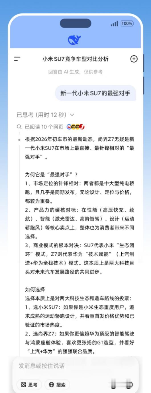 AI眼中的2026轿跑竞争格局,尚界Z7意外出圈? 最近多个主流AI平台询问“小米SU7最强对手是谁”,多数回答都指向了尚界Z7。AI的预测通常基于公开数据、用户讨论和行业声量。尚界Z7能被频繁提及,可能与其设计辨识度、品牌合作背景和市场期待值有关。尤其是“原创设计”和“双强赋能”等标签,正在形成差异化的认知。从行业角度看,轿跑市场需要持续的新鲜血液,尚界Z7能否真正成为“最强对手”,关键还要看实车体验、定价策略和用户口碑。不过,AI的集中推荐至少说明一件事,这款车已进入公众讨论的核心圈。2026年的轿跑市场,或许真的会迎来新一轮的“注意力竞争”。你看好尚界Z7吗?
