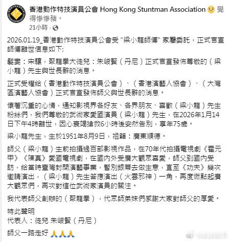 梁小龙死因公开遗孀更正梁小龙年龄 昨日,梁小龙妻子、徒弟委托香港动作特技演员工会发布讣告,梁小龙于14日下午4时因心脏衰竭去世。家属还更正梁小龙生于1951年,享年75岁。