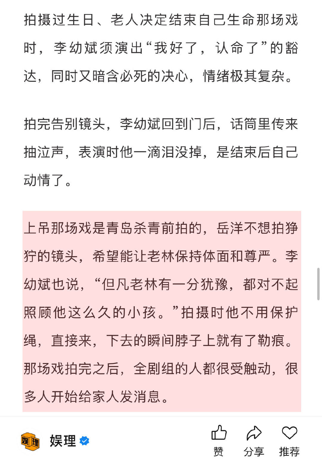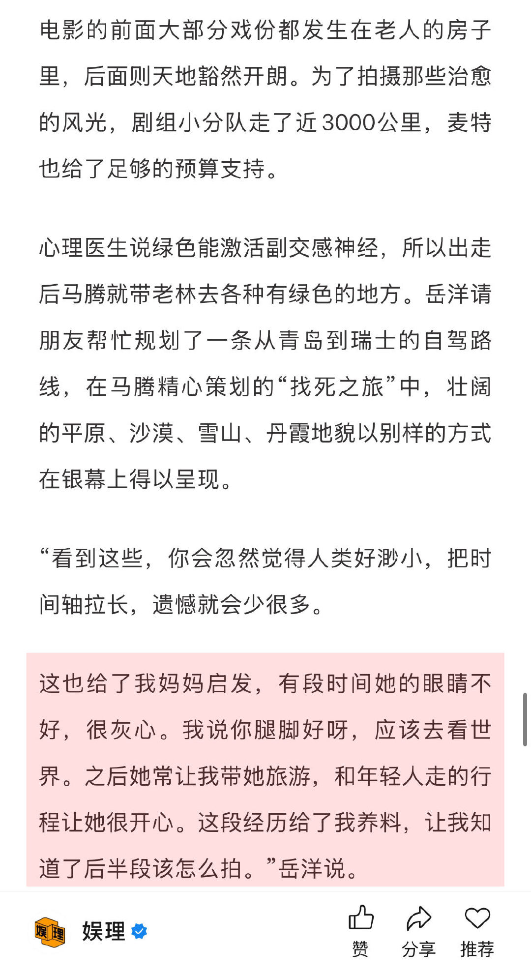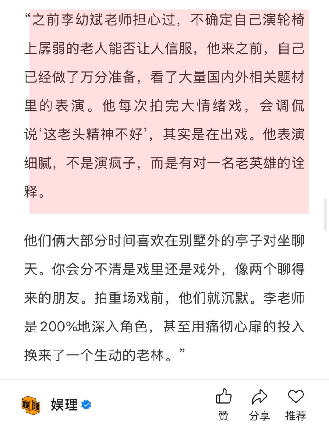 一部编剧遗作的诞生幕后 马腾导演看综艺选中林更新 《马腾你别走》导演岳洋谈选角李幼斌:“之前李老师担心过,不确定自己演轮椅上孱弱的老人能否让人信服,他来之前,已经做了万分准备,看了大量国内外相关题材里的表演。他每次拍完大情绪戏,会调侃说‘这老头精神不好’,其实是在出戏。他表演细腻,不是演疯子,而是有对一名老英雄的诠释。娱理独家↓