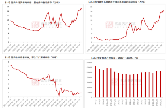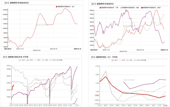 工厂原料库存方面,截至2025年12月,锂盐厂原料库存共105236吨,环比-1050吨(折LCE)。
