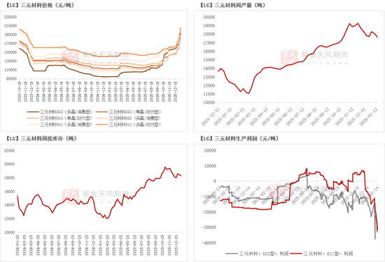 1月15日较1月9日,523型三元材料生产利润环比-7540至-29855元/吨,811型生产利润环比-9450至-29550元/吨。
