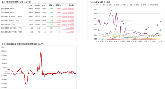 价差方面,电/工碳价差环比持平于+0元/吨至3500元/吨,电池级氢氧化锂/碳酸锂价差环比-1000至-9000元/吨。