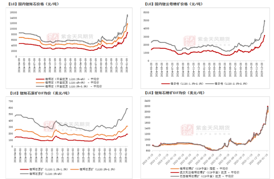 国内锂辉石精矿3%-4%、4%-5%、5%-5.5%均价格周环比分别+725、+1100、+900元/吨至8425、11500、14400元/吨;国内锂云母精矿1.5%-2.0%、2.0%-2.5%均环比分别+295、+595元/吨至3060、4835元/吨。
