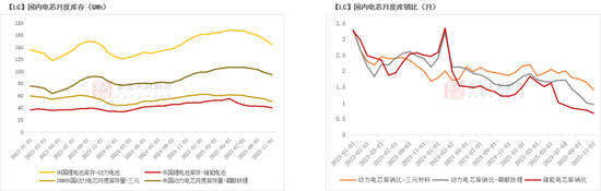 截至2025年11月,储能电芯库销比环比-0.1至0.67个月。截至2025年10月,动力三元、动力磷酸铁锂、储能电池库销比环比分别走低0.1、0.24、0.03个月至1.64、1、0.77个月。