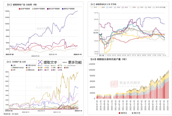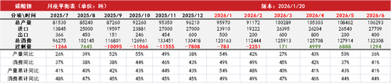 月度产量方面,据SMM,2026年1月产量环比预计减少1230吨至97970吨,环比-1.2%,其中辉石产、云母产、盐湖产、回收产碳酸锂分别+410、-850、-50、-740吨至61260、12500、14940、9270吨(SMM)。12月产量达99200吨,环比增3%,略高于月初预期。