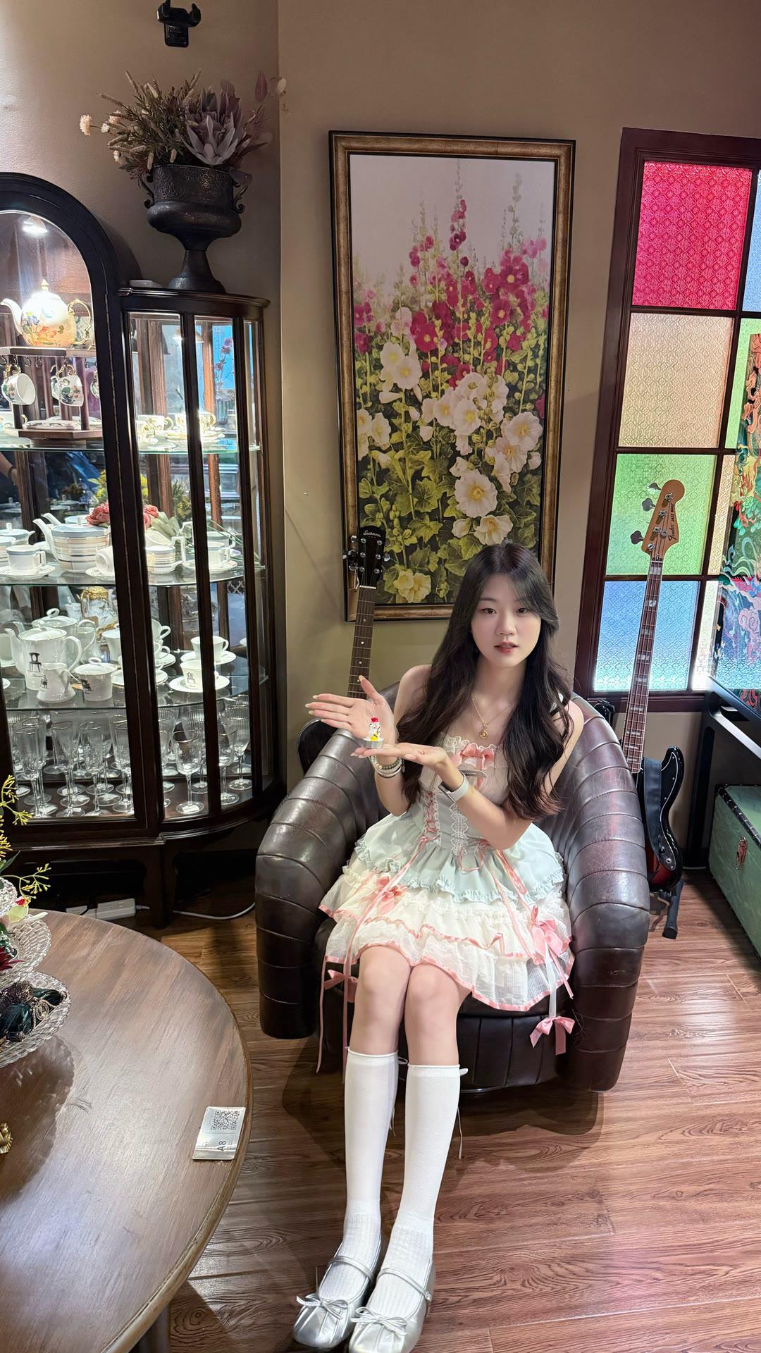 优雅黑裙搭配红底高跟鞋,咖啡馆里的时尚一刻。