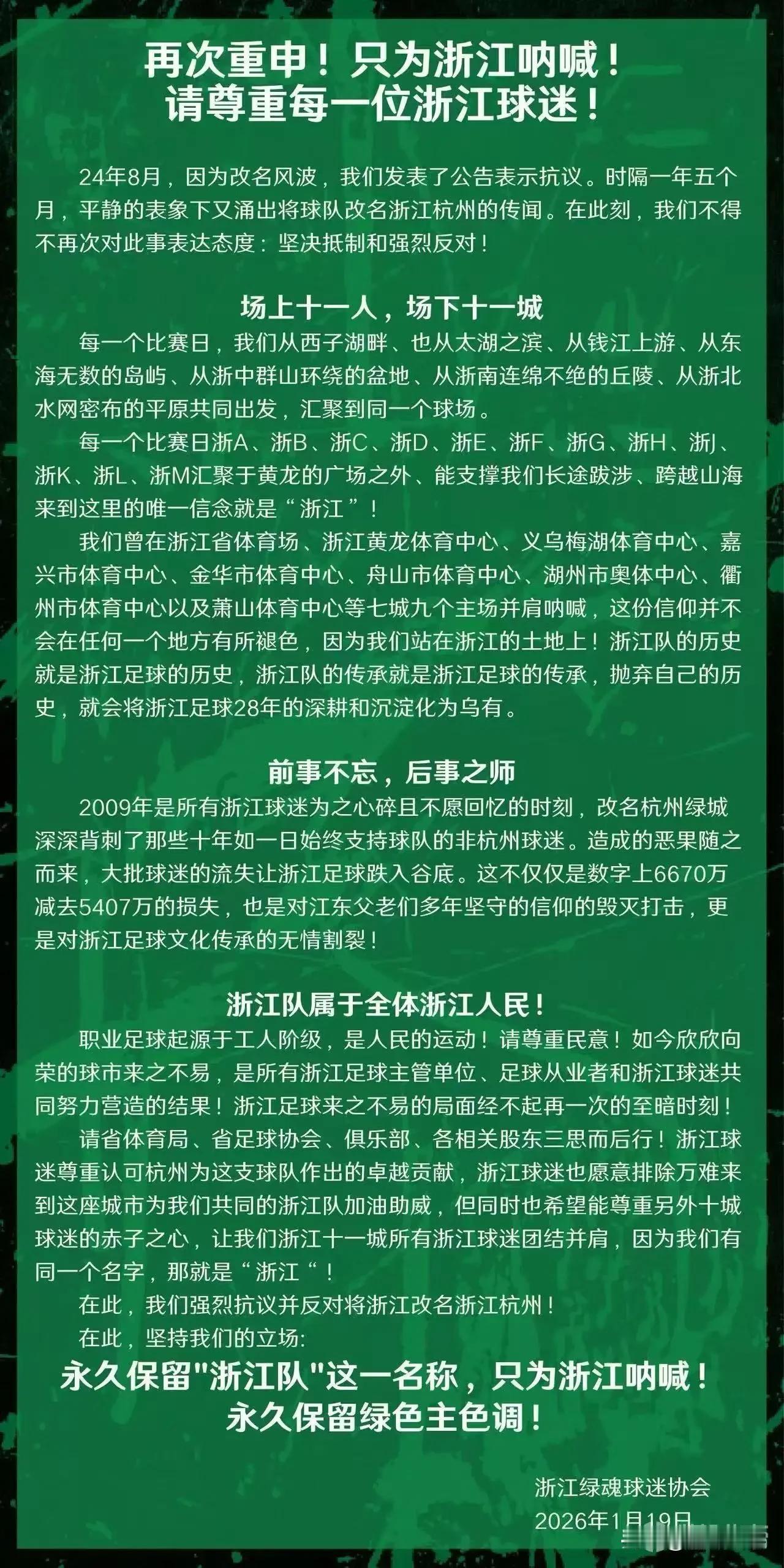 浙江队目前似乎正在重蹈几年前河南队重蹈的覆辙! 最近关于一则浙江队准备改名为杭州队的消息甚嚣尘上,并且遭到浙江队球迷的激烈反对,他们的诉求也很简单那就是保留“浙江元素”,其实对于这种情况在几年前的河南队身上也曾经发生过。 2020年岁末为顺应中国足球中性名改革,彼时的河南建业进行了第一次股改,洛阳文旅有意全盘接手,于是爆出了新赛季球队名称更改为“洛阳龙门”的消息,接下来舆论一片哗然,不出所料遭到了河南球迷的一致反对,重压之下有关部门及时介入,最终由郑州、洛阳以及建业三方联合进行股改,球队更名为河南嵩山龙门,不过由于洛阳方面并没有因此得到多大的实惠,最终选择退出,于是球队又一次更名为如今的“河南队”。 现在浙江队为了生存,准备更名为杭州队,同样也遭到了浙江死忠球迷的强烈抵制,这不仅是名称之争,而是情怀所致,当年河南队最终由政府相关部门介入迅速平息了事端,不知道这次浙江队改名风波最终将以何种方式解决。 拭目以待…