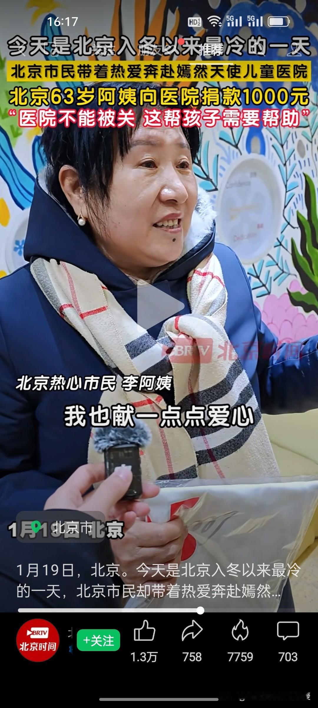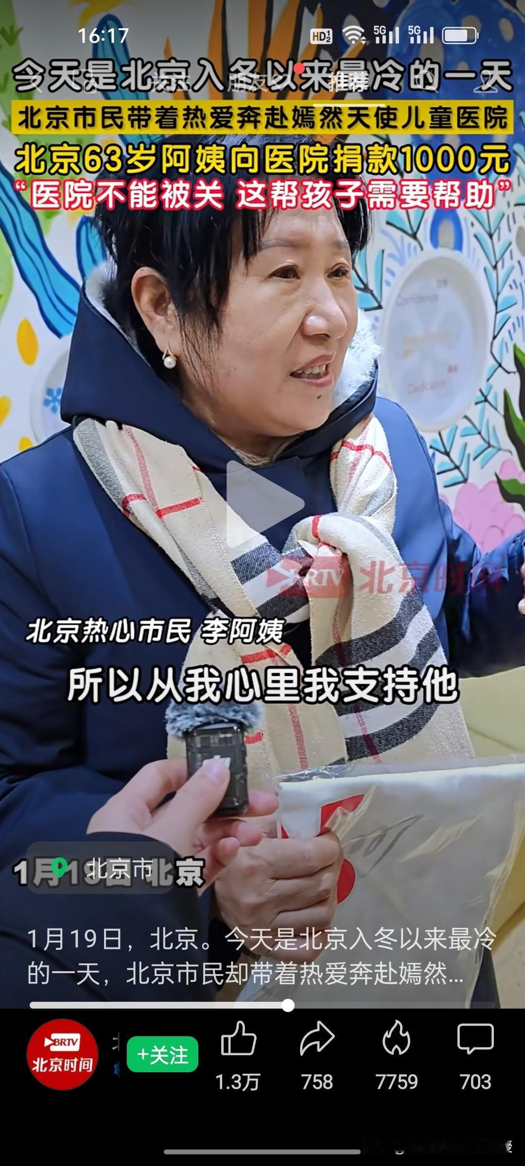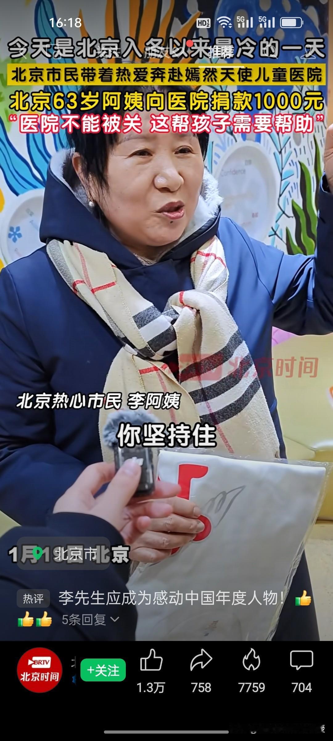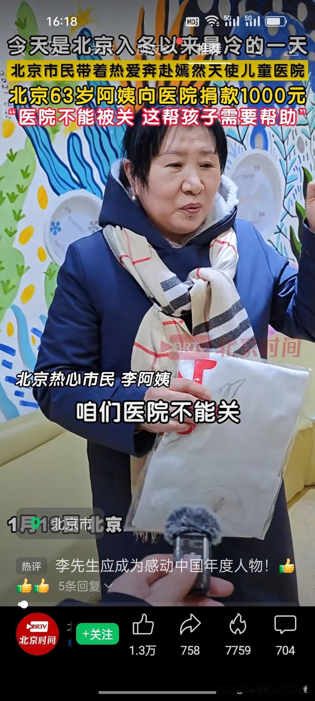 真的被北京这些素质高的退休阿姨们感动了,李亚鹏看到这一幕也会感动落泪吧! 刚刚根据《北京时间》视频报道了两位北京阿姨在医院捐款,一位阿姨说医院不能关,自己虽然只捐了1000元,后续还会银行转账,希望李亚鹏坚持住,另一位阿姨满含热泪,说看到那些治疗的孩子太可怜了,只想让他们知道北京的冬天是温暖的。 昨天还看到一位北京大爷进医院就拿出一沓崭新的100元钱放进捐款箱,进医院第一句就问工作人员,咱医院能保住吗? 不得不佩服北京这些退休的大爷大妈,拿着退休金,在零下13度的严寒中,顶着寒风,用最朴素的善意撑起了孩子们的春天。原来最暖的从来不是阳光,而是普通人藏在骨子里的善良与担当。李亚鹏“救人” 全民“救”他