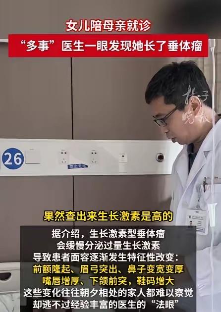 “太厉害了!江苏苏州,一女子带着口罩陪母亲到医院就诊,没想到,医生却看出她长了垂体瘤,可女子连脸都没露出来,医生仅凭她的眉骨就察觉异常,眼见女子不相信,医生表示让她去检查一下,如果是正常的话,40元诊断费他报销! 那天医院里人来人往,女子戴着口罩,注意力全在生病的母亲身上。轮到母亲看诊时,她就站在旁边,安安静静的,谁也没留意她有啥不一样。可医生问诊间隙,目光扫过她的脸,盯着眉骨处看了几秒,突然开口:“你这眉骨有点异常,可能是垂体瘤,最好去做个检查。” 女子当时就懵了,下意识摸了摸自己的眉骨,口罩遮着脸,就露个额头和眼睛,这也能看出问题?她笑着摆手,觉得医生是不是看错了:“我没感觉不舒服啊,应该没事吧。”医生却没松口,语气认真起来:“你去做个检查放心点,要是查出来没事,那40块钱的诊断费我给你报了。” 这话一出,女子心里咯噔一下。医生不是在开玩笑,眼神里的笃定让她没再反驳。后来去做了检查,结果还真如医生所说——垂体瘤。幸好发现得早,还没到严重的地步,及时治疗就能控制住。 事后想想,这医生的眼力劲儿真是绝了。咱们平时去看医生,都得把症状说半天,掀开衣服露出发病的地方,人家这倒好,隔着口罩,就凭眉骨那点细微的变化,就能揪出藏在身体里的隐患。这哪是简单的“看”啊,分明是把几十年的经验磨成了火眼金睛。 更让人暖的是医生那句“检查费我报”。他不是在炫技,是真怕病人不当回事,耽误了病情。现在有些人为了省点钱,身体不舒服也硬扛着,总觉得“没大事”,可很多病就是这么拖严重的。这位医生的一句话,可能就帮女子躲过了一场大麻烦。 这事儿也让人想起那些真正有本事的医生。他们不只是会开检查单,更能从细微处发现问题,心里装着对病人的责任心。就像这位医生,本来是看母亲的病,却顺手关注了陪诊的女儿,这份细心和担当,比什么都珍贵。 咱们常说“医者仁心”,大概就是这个样子吧。有过硬的技术,更有一颗为病人着想的心。能遇到这样的医生,是运气,也是福气。 各位读者你们怎么看?欢迎在评论区讨论。