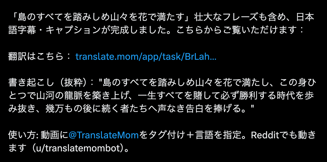 我服了,抖音上双机电弹的视频流出,日本用户对配乐非常感兴趣。。。然后他们用 AI 翻译的歌词,驴唇不对马嘴啊。。。“我将践踏岛屿的每一寸土地,让山峦繁花似锦,用我的身躯在山川河流中筑起龙脉。我将赌上我生命中的一切,步入一个我必将胜利的时代,并将这无声的告白献给追随我的成千上万的人。”这个词貌似是“他们没等到漫山的花开,却用身躯铸就了这山河的浪漫。。。”这明显是缅怀革命先烈的主题。。。被日本人给翻译成什么了。。。
