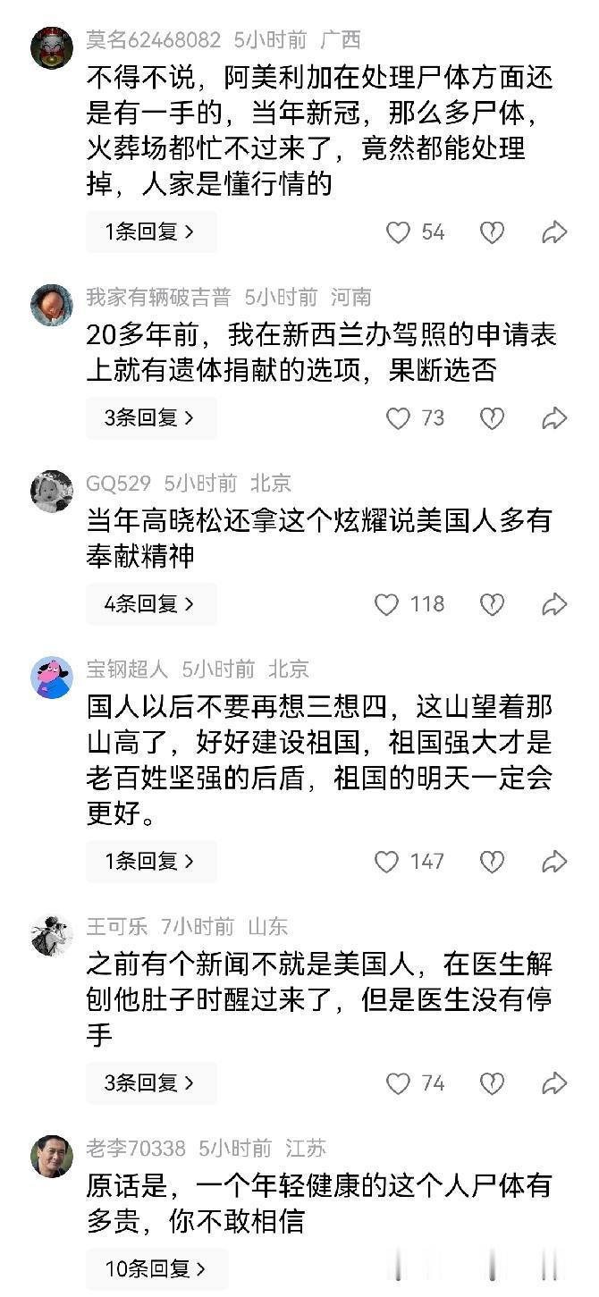 高晓松:这个(“donor器官捐献”)是个很好的制度,特别想推荐给我们政府… 牢A:千万别勾选!你不知道一个年轻健康,大脑正常,没吸强化剂,没当过童工,心跳蓬勃有力处在巅峰的身体有多值钱! … 两个人的两段话,宛如一台讽刺的微短剧: 一边是赞美诗,感叹“人类文明之光”; 另一边则是深谙昂撒人掠夺本性,熟知美国资本“身体经济学”法则。 当器官不再是生命的延伸,而成了美国资本上的估值资产,高晓松那所谓的“赞叹”便成了讽刺拉满的黑色幽默。 牢A