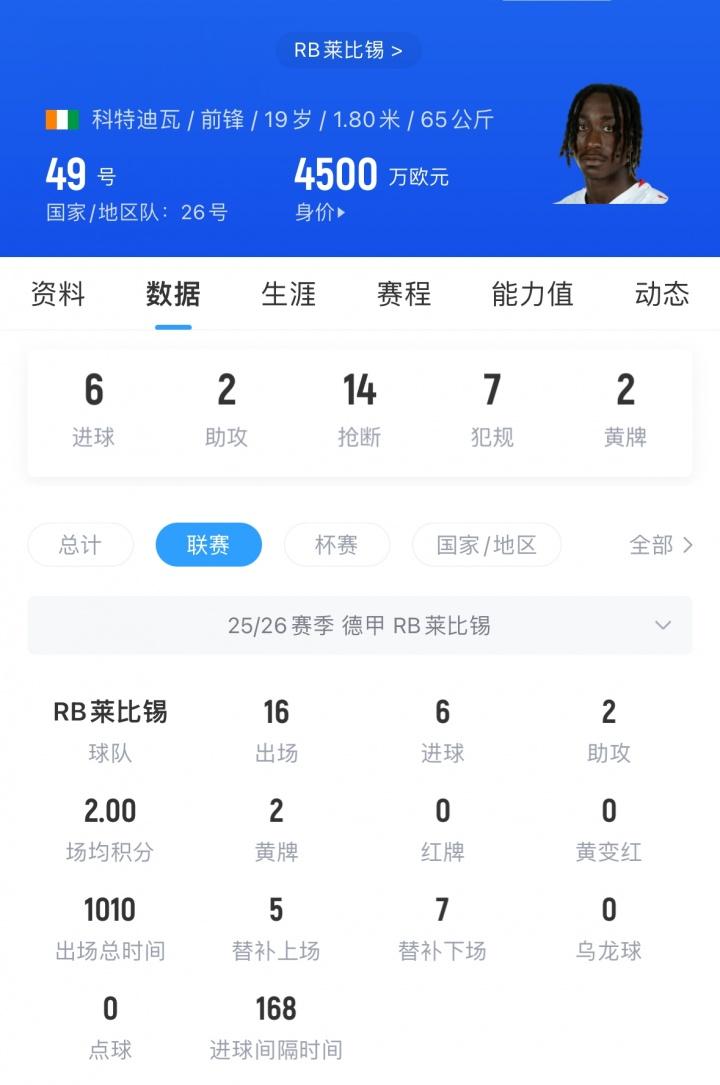 迪奥曼德现年19岁,司职边锋,他本赛季为莱比锡出场18次,贡献7球4助,现德转身价4500万欧,他与莱比锡的合同2030年到期。