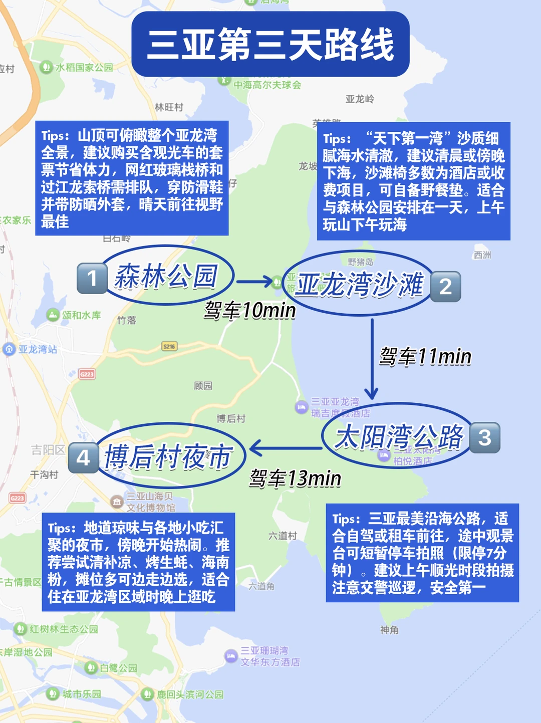 Day3:亚龙湾森林公园→亚龙湾沙滩→太阳湾公路→博后村夜市