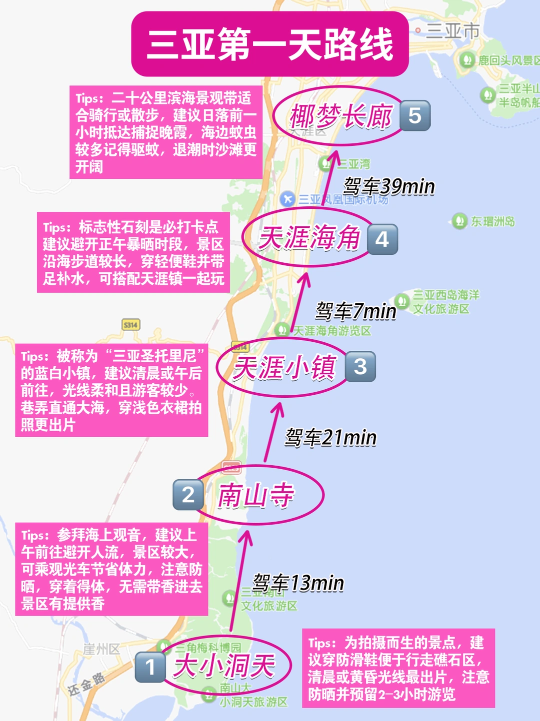 Day1:大小洞天→南山文化旅游区→天涯小镇→天涯海角→椰梦长廊