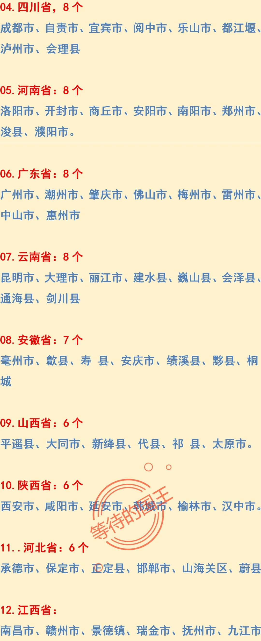 江苏:13座。居然全国最多。 浙江:10座。全国第二。 山东:10座。并列第二。 如图所示,在142座“国家历史文化名城”中,居然最多的是江苏和浙江,一般我们都认为江浙出才子,其实江浙还是我国古代文明的重要发源地。江浙自古以来就是经济繁荣之地,他们交通便利,文化昌盛,所以不仅文人多,古迹更多。另外还有一点,江浙人士非常注重维护和保护文物。因此,准确的来说,文人与文物都是江浙一带的“特产”。