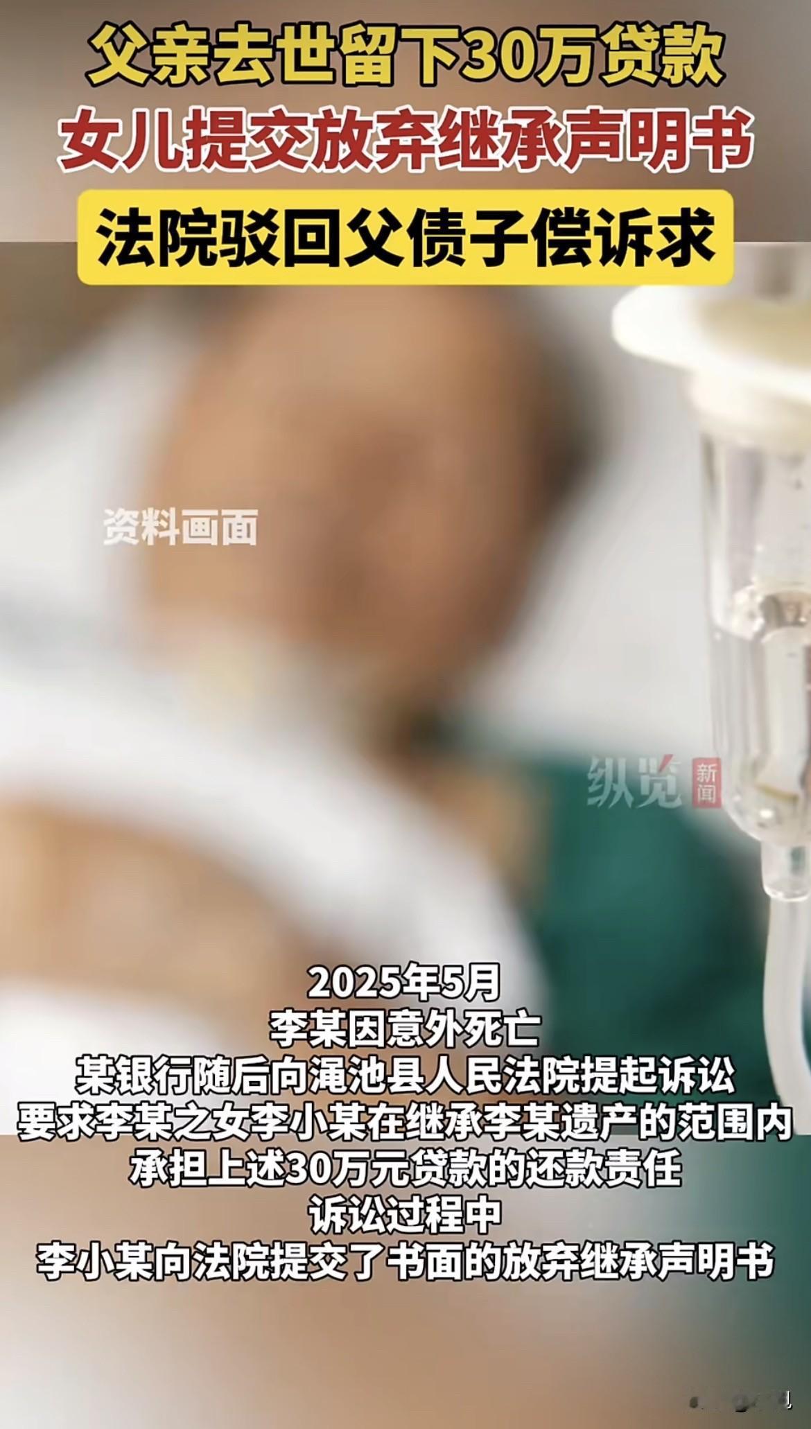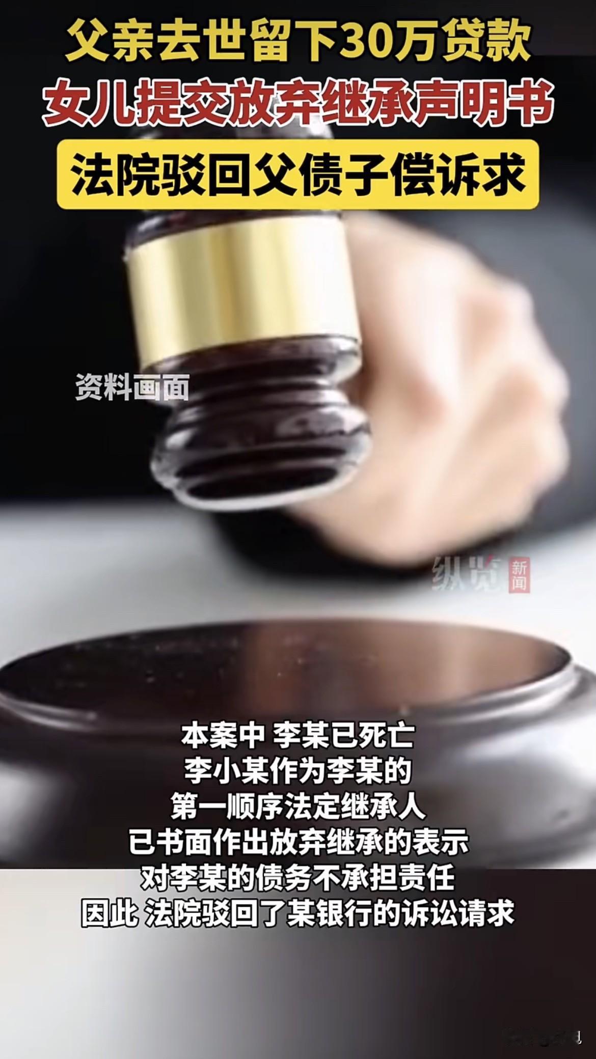 河南的老李和银行签了30万的贷款合同,不到一年,人因意外走了。银行紧接着就找到了他女儿小李。 但小李很冷静。她只做了一件事:向法院正式提交了一份《放弃继承声明书》。 法院的判决很清楚:根据《民法典》,继承人放弃继承的,对被继承人的债务可以不负清偿责任。女儿选择不继承任何遗产,父亲的债务自然和她无关。 “父债子还”从来不是铁律 这个判决,打破了很多人的老观念。“父债子还”不是天经地义,法律上有个核心原则叫 “限定继承” 。 说白了就是:你继承了多少价值的遗产,最多就还多少债。遗产不够还债的,超出的部分,法律上子女没有义务用自己口袋里的钱去填。 如果遗产是套房子,但债务比房子价值还高,继承人继承了房子,也只需用房子的价值去还债,剩下的债务不用管。 反过来,如果子女像小李一样,果断放弃继承,那么父母的债就彻底和自己没了关系。 但放弃继承,不是一张“万能免责牌” 事情还有另一面。法律给你选择的权利,但严禁你用这个权利耍小聪明。 在江西的一个真实案子里,儿子去世后欠朋友10万块钱,他的父母一边已经开上了儿子留下的车,一边在法庭上提交书面声明,说要放弃继承所有遗产。 法院一眼就看穿了。法官认定,这种已经实际占有、使用了遗产,事后却想通过声明放弃来逃债的行为,主观上具有恶意,违背了诚信原则。结果,法院判决他们放弃继承的声明无效,必须在继承的遗产价值范围内承担还款责任。 这给我们提了个醒:放弃继承必须干干净净,而且要在遗产处理之前就做出明确的书面表示。不能一边享受着遗产的实际好处,一边嘴上说不要。 那么,人死债就消了吗? 也不是。就算所有继承人都放弃了继承,债务也不会凭空消失。 这时候,法律会安排一个 “遗产管理人” 来处理。这个管理人可能是继承人推选出来的,也可能是民政部门或村委会。他们的任务,就是负责清点遗产,并用遗产本身去偿还债务。 在湖北的一个案例中,丈夫去世后留下债务,妻子和子女都声明放弃继承。法院最终指定妻子作为遗产管理人,她只需用丈夫留下的遗产去偿还债务,而不需要动用自己的钱。 所以说,债务清偿的对象,最终落还是回在遗产本身上。 几种特殊情况,子女可能得背债 法律也划出了明确的红线。在以下这几种情况下,“父债”可能真的需要“子偿”: 1. 你签了字:如果父母借钱时,你在借款合同上以担保人或共同借款人的身份签了字,那这笔债就和你绑定了。 2. 钱用于家庭:如果父母的借款确实用于家庭共同生活,比如一起做生意、支付家庭大额开支,这可能被认定为家庭共同债务。 3. 恶意串通逃债:如果父母生前故意把财产无偿赠与你,或者以明显不合理的低价转给你,损害了债权人的利益,债权人可以起诉要求撤销,用这些财产来还债。 给普通人的提醒 对于突然面临这种情况的家庭,记住两点: 第一,冷静梳理。弄清楚父母到底留下了哪些财产,欠了哪些债。 第二,及时、清白地做出选择。如果想放弃继承,就要尽早出具书面声明,并且切记不要先去动用遗产。 对于债权人来说,如果债务人去世,应及时收集证据,将继承人或遗产管理人列为被告主张权利,而不是想当然地认为可以找其子女索要。 现代社会,每个人都是独立的民事主体。父母和子女的财务,在法律上是分开的。 “父债子还”不是法定义务,而是一种可能的选择。这个选择,必须在法律框架内,干干净净地做出。 如果是你,你会怎么选?你会为了保全自己的小家而放弃继承,还是会选择承担债务以保留对父母的一份念想?