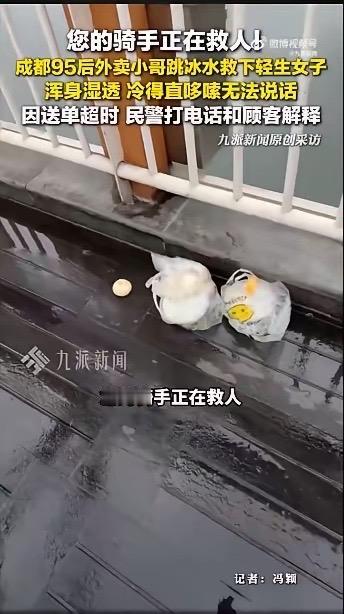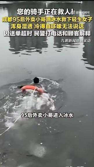 四川成都,一名95后外卖小哥正在送外卖途中经过桥时,听到有人跳河,疑似轻生,而且女子还怀着孕!外卖小哥听到后,停下车马上下水去救人,还好水流不湍急,外卖小哥两次下冰冷河水拉轻生女子,最终轻生女子被消防救上岸。 1月19日上午10点,成都高新区红树湾人行桥上寒风刺骨,气温只有4-5℃。外卖骑手唐琪正骑着配送车经过这里,突然看到桥面聚集了不少群众。原来一名年轻女子从天桥跳入了河中,在湍急的水流中挣扎,情况十分危急。 唐琪立刻停稳配送车,迅速脱下外套和鞋子,抓起救生圈就跳进了冰冷刺骨的河水里。第一次下水,湍急的水流让他无法靠近女子,他只好返回岸边。稍作调整后,他选择从上游位置再次跃入河中,这次成功游到了女子身边。 靠近女子时,唐琪发现她已体力不支。他一边用救生圈稳住女子,一边轻声安慰:“不要怕,有什么事都能慢慢解决。”这时救生圈突然破裂,唐琪只能一手死死拉住女子,一手抵挡水流冲击,在冰冷的河水中等待救援。 消防救援人员很快赶到现场,大家合力将两人救上岸。刚从水里出来的唐琪浑身湿透,双手冻得通红,在警车里吹了20分钟暖风才缓过来。 缓过神后,唐琪才想起还有订单没送。一位目睹全程的路人大哥主动帮他联系顾客说明情况。顾客得知唐琪是因为救人耽误送餐,连连表示理解,不需要赔偿。 唐琪今年30岁,已是两个女儿的父亲。他曾创业失败负债累累,去年开始跑外卖,月收入稳定在1万元以上。谈到救人初衷,他说:“订单没送到最多扣点钱,但人的生命只有一次,根本没法比。” 唐琪所属外卖平台授予他“城市骑士社区侠”荣誉称号,并颁发5000元现金奖励。中共成都市委宣传部也将为他颁发“平凡之善卡”,褒奖这种凡人善举。 这个寒冷的冬日,唐琪用两次纵身一跃,托起了生命的希望。他说希望为两个女儿树立榜样,继续在力所能及的范围内做好事。 各位读者你们怎么看?欢迎在评论区讨论。