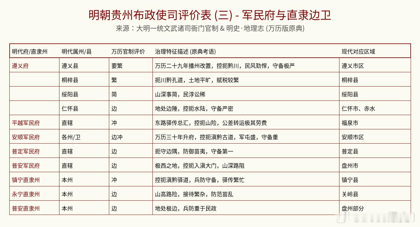 这份关于明朝贵州布政使司(含部分现在划归四川、重庆、广西的区域)的官方评价,主要参考了《大明一统文武诸司衙门官制》和明代《地理志》。在明朝,贵州是全国最晚建省的地区之一(永乐十一年才建省),当时被称为“万山丛中”的卫所林立之地。官方给出的评价,字里行间透着一股“拓荒者”的艰辛与豪迈。这里没有江南的苏杭繁华,只有最硬核的“生存模式”。快来看看你老家在明朝是什么人设?中心卷王:新贵县(今贵阳核心区) 评价直接给到“繁剧”! 当时的贵阳虽然刚起步,但作为省会,这里是“全黔枢纽,五方杂处”,词讼特别重,接待任务也最繁琐。在这里当差,每天处理各种纠纷,估计头发得掉一大把。🤯全省最忙服务区:镇远府(镇远州) 评价是惊人的“极冲”! 因为它扼守“沅江枢纽”,是全国进入贵州的唯一“孔道”,所有的驿传物资、官员入黔都得走这儿。官方盖戳:“黔东第一要塞,驿传极劳”。说白了,镇远就是全大明最忙的西南中转站。最硬核保镖区:遵义县、安顺、平越遵义:评价是“要繁”,刚从土司播州改置过来,民风劲悍,守备极严。安顺/安宁:评价是“边冲”,关键词是“军屯盛,守备重”。这里的人不是在种地,就是在随时准备拿刀的路上。隐形避世区:思南、开州(开阳)、印江 关键词:“简”。 这些地处深山的县,评价多为“山僻民淳”、“俗淳事简”。如果你想在大明找个没啥糟心事、官司少的地方“躺平”,选这些县准没错。各位贵州老乡,快来评论区认领你家在明朝是负责“保安”还是负责“接领导”?👇