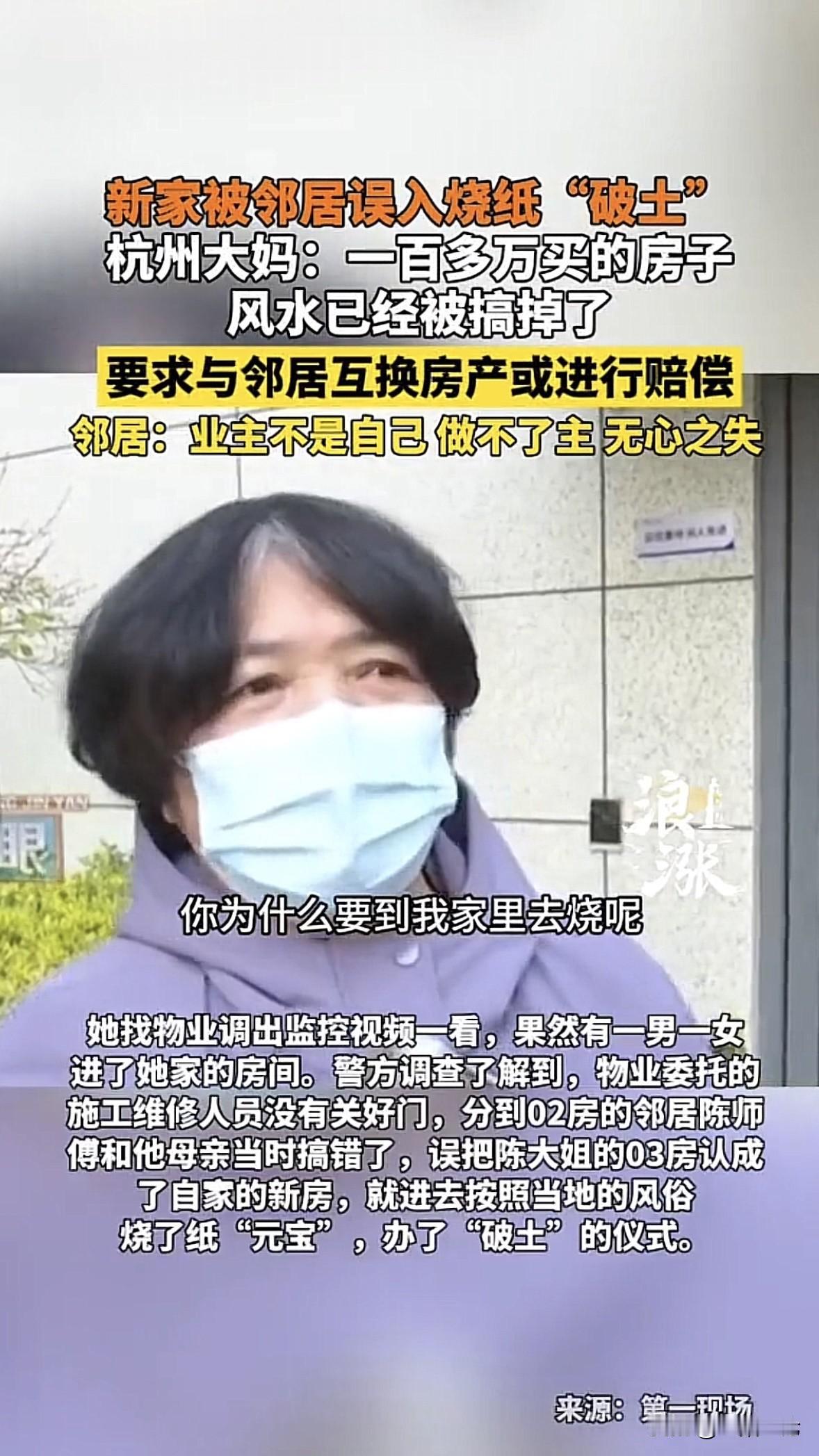 杭州萧山,女子分得一套回迁房,还没装修,这天她来到新房,发现门半掩着,客厅地上有一堆纸灰,女子脸色大变,怀疑有人在她家新房烧纸,她一调监控,是邻居母子所为,她怒气冲冲找上门,对方解释说走错门了,把女子家当成了自己家,这才办了“破土”仪式,女子不接受,认为自己一百多万的房子被坏了风水,她要求邻居要么跟她换房子,要么给她赔钱。 陈大姐前阵子刚拿到回迁房的钥匙,这可是件大喜事。 她家分到的是03号房,因为是毛坯,墙面有点空鼓需要修。 陈大姐平时工作忙,图省事就把钥匙直接扔给了物业,委托他们找人维修。想着物业管着,应该出不了啥岔子。 可就在前两天,陈大姐想着去看看维修进度,顺便憧憬一下以后怎么装修。 结果一到门口,她就发现大门是虚掩的,没锁。 她推门进去,一股烧焦的味道直冲脑门。再往客厅一看,只见水泥地上一堆黑乎乎的纸灰,风一吹还在飘,旁边还插着一根没烧完的旗杆,整个客厅被熏得乌烟瘴气。 陈大姐看完脸色瞬间不好了,她严重怀疑有人在她家烧过纸。 她强忍膈应,赶紧找物业调监控。这一看,真相大白。 监控里显示,进她家的是一男一女两个熟人。那就是住同单元02号房的邻居陈师傅和他老娘。 原来,物业找来修空鼓的工人干完活,粗心大意没把门关严实,留了条缝。 这陈师傅家也是刚分的回迁房,老太太讲究,非得按老规矩搞个“破土”仪式,图个吉利。 坏就坏在这“破土”上。陈师傅和他妈拿着钥匙开02号房,可能是因为楼层一样、户型一样,加上心里想着仪式,迷迷糊糊就走错了门,进了陈大姐的03号房。 俩人也没细看,以为到了自己家,这就开始烧纸元宝、插旗磕头,一套流程走完,把陈大姐的新房当成了自家的法坛。 陈大姐看完监控,脸色铁青,不是吓的,是气的,更是觉得晦气。 陈大姐说,这可是我花一百多万换来的房子啊!还没住人呢,让别人这么一搅和,这算怎么回事? 在她们当地,风水是个顶顶重要的事儿。 没破土的房子是干净的,一旦被人先搞了仪式,那这房子的气就被别人动过了,自己再住进去,心里那道坎过不去。 她找到陈师傅家,说这房子我没法要了,要么你把你家的02号房跟我换,要么你赔我钱。 陈师傅一家也是懵的,本来是好心办坏事,想图个吉利,结果惹了一身骚。 陈师傅一脸尴尬,说大姐,我也不是故意的,门开着我就以为是自家……再说,房子是集体的,我也做不了主换房啊。 陈大姐一听更火了,说你做不了主?你带着你妈进我屋烧纸的时候怎么不想想做不了主?现在跟我说这个?我这房子风水坏了,以后贬值了谁负责? 我也不是不讲理的人,看你家条件一般,我也不多要,给个几万块钱意思一下,这事儿就算翻篇。不然这房子我就砸手里了,谁敢住? 陈师傅一听几万块,脸都白了。对于普通回迁户来说,几万块不是小数目。 他支支吾吾,说这就是个迷信,科学上讲没影响的……我们也道歉了,能不能少点? 陈大姐却不认为这是迷信,这是她们这儿的老风俗。别人不信,可她信啊!几万块买个心安,已经是看在邻居份上了。 现在这事儿已经闹到了村委。目前,村委还在两头做工作。 从法律上讲,陈师傅误入他人住宅,造成了事实上的污染和心理不适,确实构成了侵权,该赔清理费甚至精神损失。 但从陈大姐的角度看,这不仅仅是钱的问题,更是心理上那种房子被别人先占了彩头的膈应。 那从法律角度怎么看这件事? 《民法典》第1165条第1款规定:行为人因过错侵害他人民事权益造成损害的,应当承担侵权责任。 法律上的过错包括故意和过失。在这个案子里,没有人是故意要搞破坏,但过失也是过错。 陈师傅作为完全民事行为能力人,去烧纸破土这么大的事,他却连门牌号都没看清楚,迷迷糊糊就进去烧了。 这属于未尽到合理的注意义务。你进别人家门不核实,这就有过失。 陈大姐把钥匙委托给物业维修,物业找来的工人干完活没关好门,这是典型的管理疏忽。如果门关好了,陈师傅就算想进也进不去。所以物业方也有明显的过错。 虽然陈师傅是无心之过,但从法律角度看,不小心造成了别人的损失,一样要承担责任,不能因为一句我不是故意的就免责。 虽然法律不保护封建迷信,但法律保护因他人行为造成的严重精神痛苦。 如果陈大姐只是觉得有点晦气吧法律可能不支持赔钱。但如果这种“晦气”导致她产生了强烈的心理排斥、恶心、失眠,甚至因为当地风俗极大地影响了她的社会评价和居住意愿,这就可能构成严重精神损害。 但是,陈大姐需要举证证明这种损害是客观存在的、严重的。如果仅仅是我觉得晦气,法院很难支持几万块的精神损失费。 对于这件事,你怎么看? 欢迎关注@一案一论