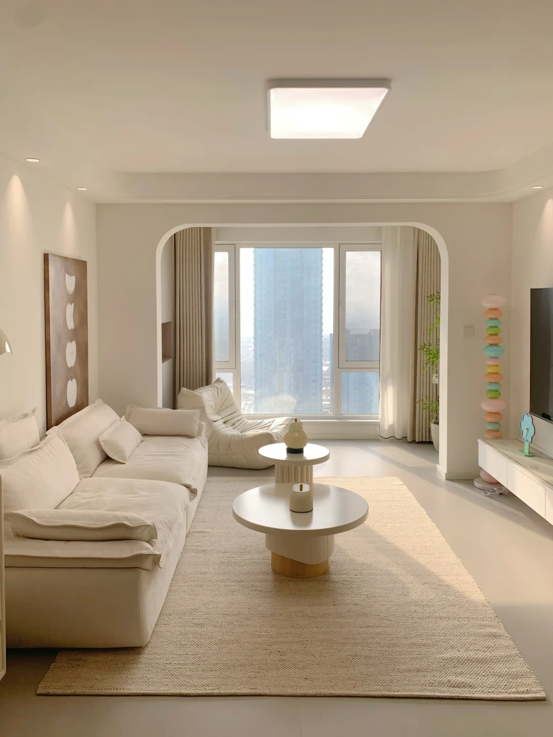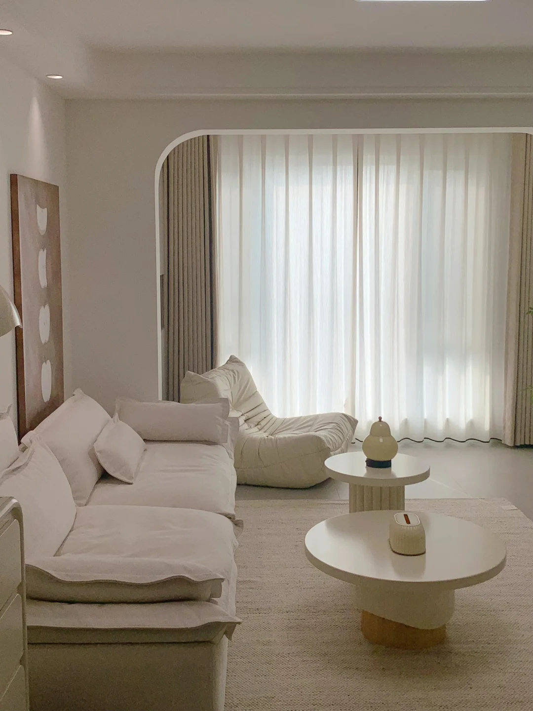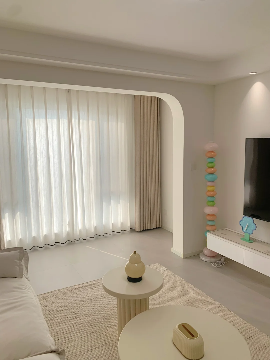 🏠我家房子建筑面积85平,套内63平 自装红薯抄作业装出来的简约奶油风 - 因为整体就是温馨的暖色调 窗帘我也选了浅浅的奶茶色 这个颜色是介于奶白和奶咖之间 不会过白也不会过黄 奶唧唧的和浅色调很搭 上面有很好看的花纹 - 纱帘用的是扶风纱 记住啊,窗帘作为客厅的大色块软装 能浅不能深 不管是拉开还是拉住 都能很大程度的影响客厅的装修风格 - 我家用的这款 背后加了遮光层 哪怕是中午太阳很大的时候拉上窗帘都能有效避光 而且因为布料够厚完全不会透出底色 浅色窗帘安全下车 可以来抄作业