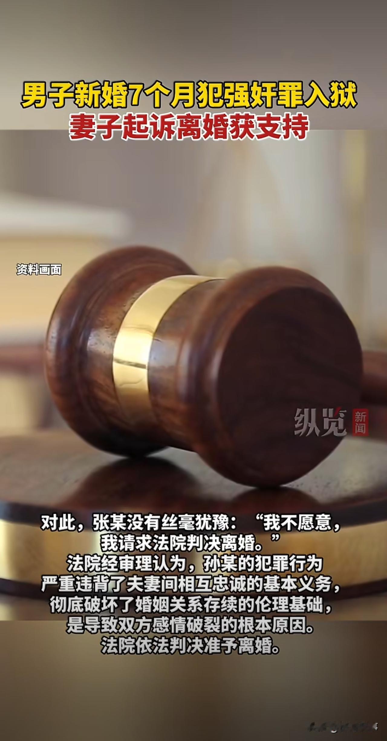 “嫁给了一个渣男!”新疆,女子和丈夫刚结婚7个月,却被告知丈夫被判了3年2个月。让女子更崩溃的是,丈夫获刑的罪名居然是qj。事后,女子第一时间向法院起诉离婚。庭审中,丈夫忏悔,请求女子再给一个机会。对此,女子态度坚定:“我不愿意!” 张女士和丈夫孙某是经人介绍相识的,两人在短暂相处后,觉得互相合的来,彼此之间都合适,便很快确定婚事,领取了结婚证。 本以为这是两人幸福的开端,可谁曾想,这场婚姻仅维持了7个月就迎来灭顶之灾。 由于孙某背着张女士在外面不检点,很快,他因犯事被警方逮捕。 后来,孙某被判刑,直到他被送往监狱服刑,张女士才知晓此事。 张女士得知此事后,一时间难以接受。而当他得知丈夫所犯的是qj罪时,更是如遭雷击。 张女士直言,她无法忍受那个自己曾托付终身的人,竟做出如此不堪之事。 悲痛过后,张女士向当地法院起诉离婚,希望彻底与这样的人斩断联系。 在开庭当天,孙某仍心存侥幸,通过视频连线忏悔,恳请能够得到妻子的原谅,但张女士态度坚决:“我不愿意,请求法院判决离婚。” 是啊,对于任何女子而言,刚结婚半年,丈夫就在外面和别的女子发生亲密关系,还因此犯罪获刑,这无疑是毁灭般的打击,是对感情和尊严的双重践踏,又怎能让人大度的起来呢? 《民法典》第1043条明确规定,夫妻应当互相忠实、尊重、关爱。 这意味着忠诚是法律赋予的义务,不是空话。 孙某的qj行为,既触犯刑法,更彻底背离忠诚义务,完全摧毁了他同张女士婚姻存续的基础。 根据《民法典》1079条规定,夫妻感情确已破裂是法院判决离婚与否的唯一标准。 而根据《最高人民法院关于人民法院审理离婚案件如何认定夫妻感情确已破裂的若干具体意见》第11条规定:一方被依法判处长期徒刑,或其违法、犯罪行为严重伤害夫妻感情的,视为夫妻感情确已破裂。一方坚决要求离婚,经调解无效,可依法判决准予离婚。 显然,孙某被判三年多有期徒刑,且qj罪性质恶劣,对夫妻感情造成毁灭性伤害。张女士又坚决要求离婚,无和好可能。 结果毫无异议,法院最终依法判决准予张女士离婚。 总的来说,婚姻不是儿戏!但凡张女士和孙某相处的久一点,多了解对方价值观和道德底线,也不至于刚踏入婚姻七个月,就遭遇这样的打击。 这也提醒所有人,对待婚姻,一定要多一分谨慎,少一分冲动!毕竟,和一个三观正、知底线的人相伴,才是对自己的人生负责。 对此,你怎么看呢?欢迎大家在评论区留言。