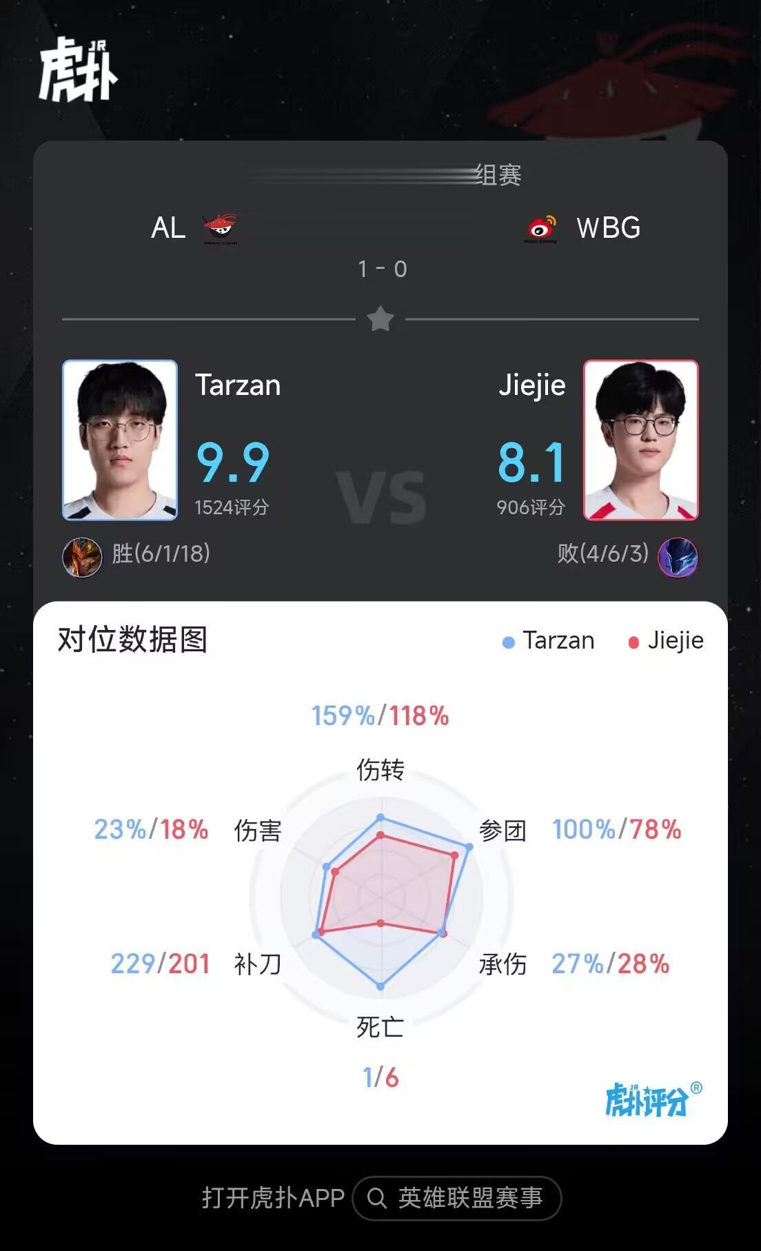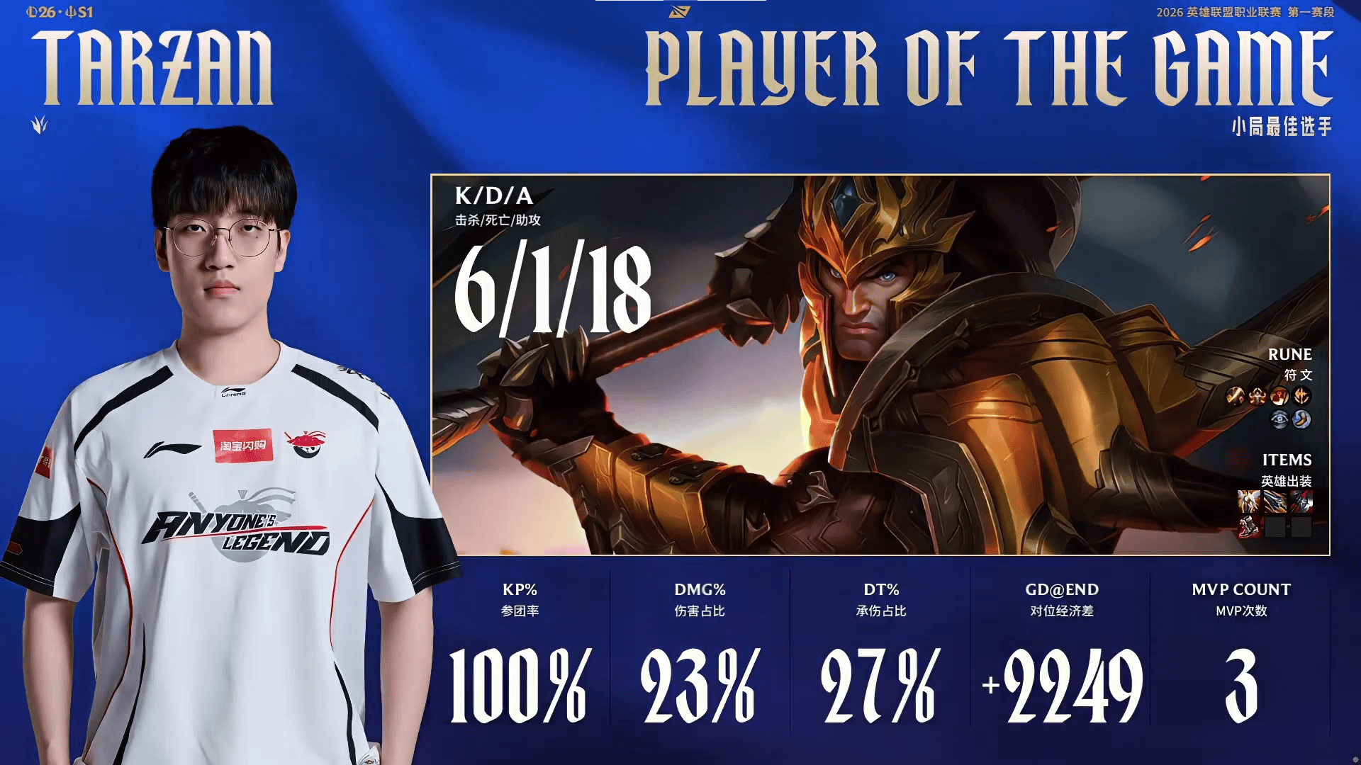 虎扑01月20日讯在刚刚结束的LPL第一赛段的比赛中,Tarzan皇子砍下6/1/18的战绩,拿下AL对阵WBG首局MVP