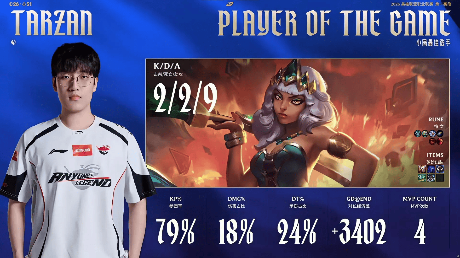 Tarzan奇亚娜打出2/2/9的战绩,拿下AL对阵WBG次局MVP