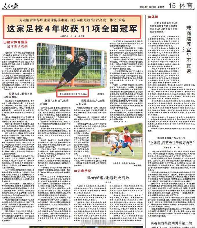 山东泰山人民日报体育版整版报道鲁能足校 2026年1月20日,《人民日报》以《4年收获11项全国冠军,这家足校是如何做到的?》为题整版报道了山东泰山足球学校(原山东鲁能泰山足球学校) 。以下是报道的主要内容 :亮眼成绩自1999年成立以来,泰山足校累计向各级国家队输送球员326人,向国内三级职业联赛输送球员380人。2022年至2025年,足校各梯队共收获11项全国青少年赛事桂冠,不少球员渐渐在各年龄段国家队站稳脚跟。资源共享,退役名将转型当教练2021年起,泰山足校推行“高度一体化”策略,聘请韩鹏、周海滨、崔鹏、汪强等泰山队退役名将担任各青训梯队教练。以周海滨为例,他于2022年初接手U15梯队,通过耐心指导和针对性训练,帮助队员提升技术水平,该梯队在4年间先后捧回4座冠军奖杯,周海滨也3次荣获“最佳教练”称号。训练“上科技”,比赛上强度:2018年,泰山足校引进可穿戴设备,通过设备教练组可以详细掌握、准确分析球员的各项运动指标,让训练更科学、更有针对性。同时,足校为各梯队球员“搭台”,通过高质量比赛帮助球员涨球,如李钧鹏等球员就通过参加高水平赛事脱颖而出,多次入选国少集训队。锻炼适应能力,加强人员交流泰山足校注重锻炼球员的适应能力,通过安排队一线到足校集训等方式,加强不同队伍间的交流,让青训球员近距离感受职业队的节奏和氛围。在“传帮带”的过程中,年轻球员逐渐成长,如彭啸凭借在中乙联赛的优秀表现,成功跻身一线队大名单,并在2025赛季代表山东泰山一线队登场11次,发挥出色。中国足球青训
