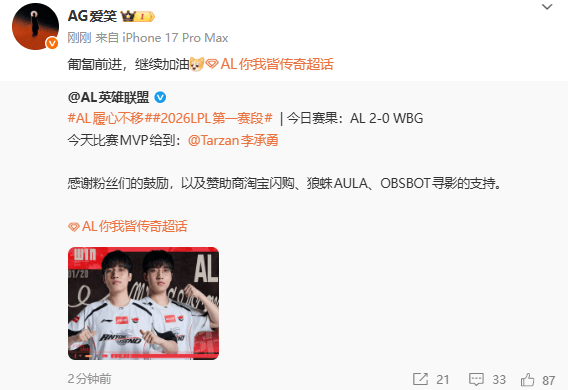 虎扑01月20日讯战胜WBG终结连败后,爱笑发文:匍匐前进,继续加油