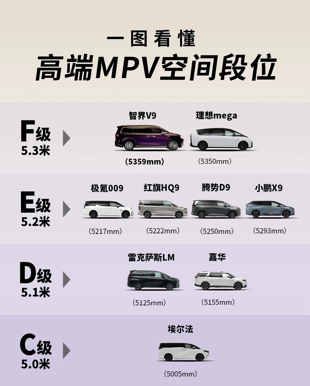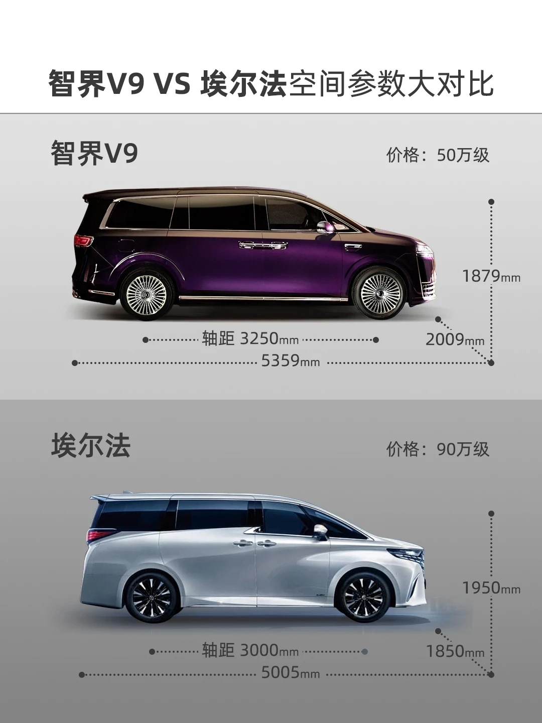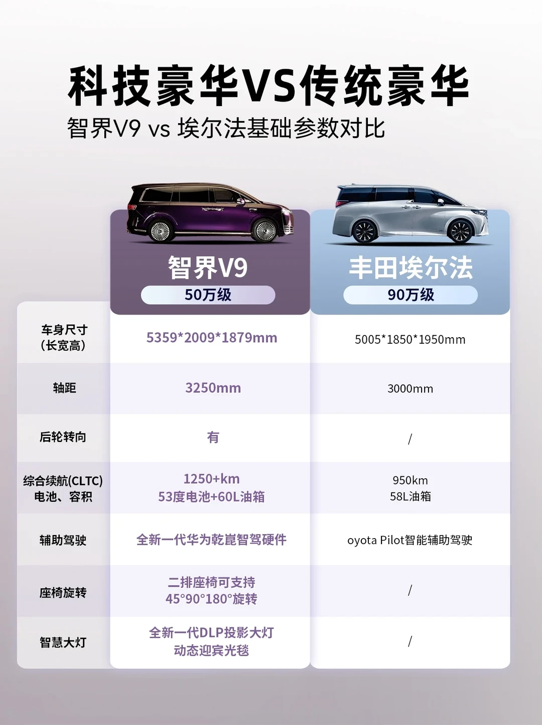 把这些MPV拉到同一张表里,智界V9的优势其实很直观:5.3米车身、3250mm轴距,已经站到F级空间区间,后轮转向、可旋转座椅、投影大灯,全是真提升体验的配置。对比理想Mega、极氪009、腾势D9、小鹏X9,V9在空间级别和玩法上更激进。再看丰田埃尔法,智能化落后,价格高一档,尺寸还小一圈。50万做到这一步,高端MPV的价值锚点,是不是已经被改写了?