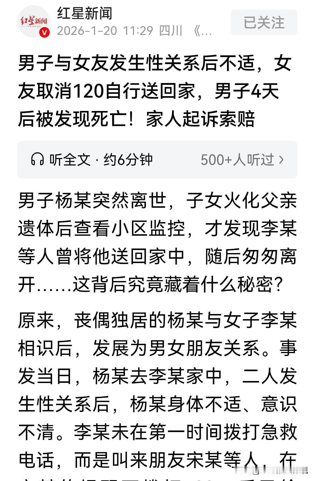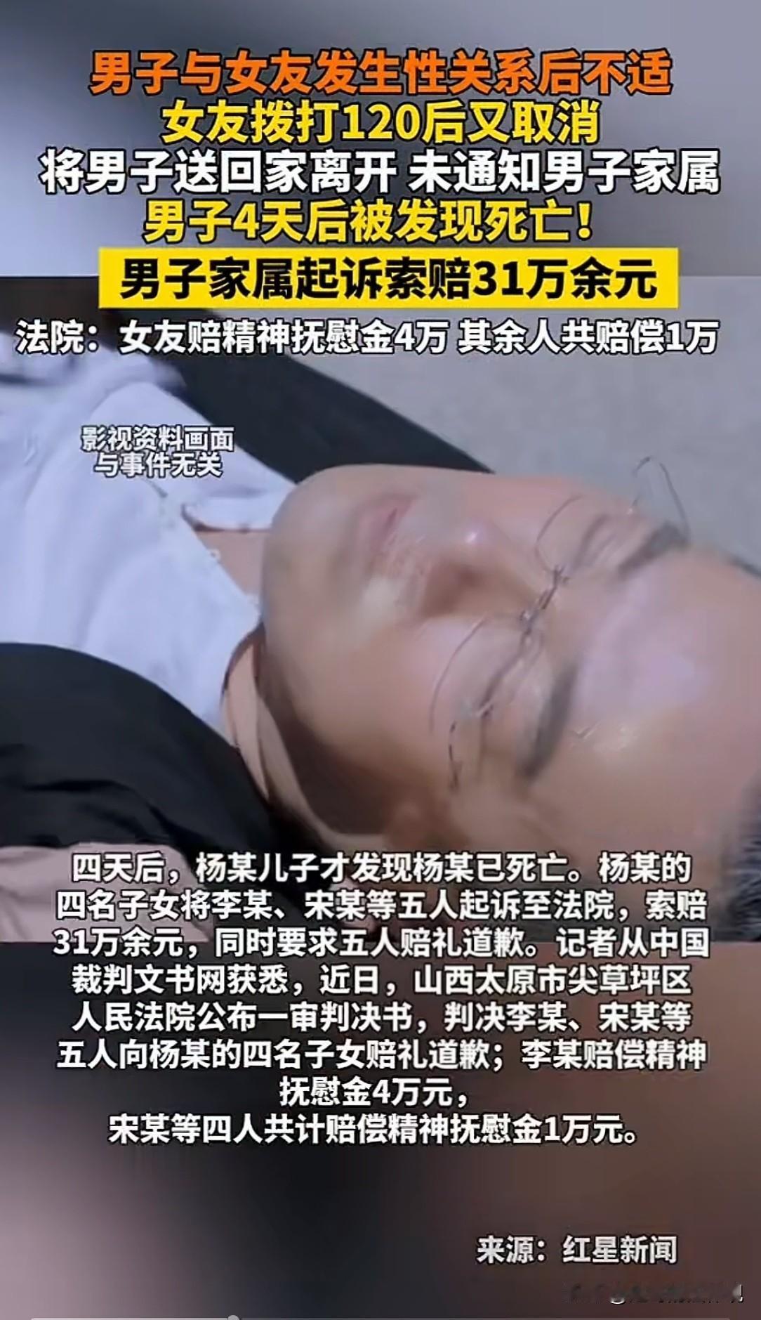 山西太原,一男子在女友家,双方发生关系后,突发不适,意识不清。女友叫来4个朋友,并在朋友的提醒下,拨打了120急救,之后又取消,5人将男子送回家中离开。4天后,男子家人发现其死亡,男子火化后,家人调取了小区监控,发现男子女友等5人,曾将他送回家后匆匆离开。男子女子将5人告上法庭,索赔损失31万余元。法院这样判了。 杨某的老伴已去世多年,4个子女不在身边,他一直是一个人居住。 后来杨某觉得一个人很孤单,就想找个伴儿,到时候身边有个说话聊天的。 之后他认识了李某,两人脾气相投,他们以男女朋友相处,但没有登记结婚。 2023年5月7日上午,杨某去李某家中,两人忍不住发生了关系。 谁知办刚完事,杨某就感到身体不适,李某吓坏了,问他怎么回事,严不严重? 杨某没来得及回答就失去了意识,连话也说不清了,李某顿时慌了神,她不知道该怎么办了。 只好给自己的朋友打了电话,宋某等4人来到李某家里后,发现杨某不对劲。 宋某提醒李某打120,别真发生危险,李某这才拨打了急救电话。 可他刚联系好急救人员,杨某就醒了,李某又联系急救人员,称病人不需要急救了。 随后,李某又和宋某、张某等人,(张某开车,一直没有下车),将杨某送回了他自己的家。 在杨某意识不清的情况,5人将他扔下匆匆离去,甚至没有通知他的子女。 杨某的家人一直联系不上他,4天后,上门查看才发现他已经死亡。 杨某因为是一个人住,家人以为他是突发疾病去世,悲痛之余并未多想,正常给办理了火化。 事后,杨某的子女调取了小区监控,这才发现,事发当天李某等5人将杨某送回家后离开的情形。 杨某的4个子女不知发生了什么,立即报了警。 警方查看监控后,找到李某、宋某等人询问,并将案件移交检方。 2024年4月16日,当地检方以现有证据无法认定李某等人的不作为,与杨某的死亡有因果关系,不符合起诉条件。 杨某的4个子女无法释怀,觉得不能让父亲死的不明不白,于是将李某和她的4个朋友起诉到法院。 要求李某、宋某等人共同赔偿,包括死亡赔偿金在内的丧葬金、精神抚慰金、交通费等,共计31万元。 同时要求,判令李某等5人赔礼道歉。 李某辩称,对杨某的突然不幸去世,感到万分羞愧,也万分抱歉。 可自己只是杨某的女友,在他突发意识不清时,当时完全吓懵了,不知道该怎么办。 后来在朋友的提醒下,拨打了急救电话,但杨某又清醒了,所以才取消了急救,请朋友帮忙将他送回了家。 杨某的去世,属于意外事件,自己不应当赔偿。 李某的4个朋友称,他们只是李某的朋友,是被叫来帮忙的。 因此,他们并无义务对杨某救护,所以也不应承担赔偿责任。 而这种情形,从法律的角度来说,属于先行行为引起的救助义务。 也就是说,杨某和李某发生关系后,出现身体不适等危险状态。 而李某作为直接关联人,应对杨某的人身安全,负有注意和救助的义务。 李某在男友发生身体不适时,本应及时拨打急救电话,而李某非但没在第一时间及时救助。 反而在联系了急救人员后,又取消了救助行为,因此李某违背了这一义务, 而李某的4个朋友,在发现杨某处于危急状态时,应及时劝阻李某对病人进行救治。 但4人反而协助李某将杨某送回家。 他们的行为,相当于默认李某的不作为。 法院经审理后认为,李某明知杨某有生命危险,但未及时采取正确的救助措施。 反而找宋某、李某丙、樊某、张某等,帮忙将杨某送回家,其行为违背公序良俗。 但本案中杨某的子女,没有提供证据证明,其父亲的死亡与5名被告有因果关系。 因此对他们提出的,要求李某等人赔偿各项损失的请求不予支持。 但李某等人的行为,给杨某子女造成了精神损害,应给杨某女赔礼道歉,赔偿相应的精神损失费。 《民法典》第1165条:行为人因过错侵害他人民事权益造成损害的,应当承担侵权责任。 李某与杨某发生关系后,杨某突发不适,李某作为直接关联人,因先行行为负有救助义务。 但其拨打120后又取消,且未通知杨某家人,属于未履行合理救助义务,存在过错。 《民法典》第8条:民事主体从事民事活动,不得违反法律,不得违背公序良俗。 李某及4名朋友在杨某意识不清时,未确保其得到有效救治,便将其独自留在家中。 既不符合道德常理,也违背了社会公共秩序所倡导的互助义务。 法律既要求行为人对自身过错导致的损害负责,也通过公序良俗约束行为符合社会道德。 本案中,虽无直接证据证明,死亡与被告行为有因果关系。 但李某等5人,未履行合理救助义务、违背道德的行为,所以,5人仍需承担精神赔偿,和赔礼道歉的责任。 最终,法院综合考虑5人的过错程度,判决李某赔偿杨某子女精神损害费4万元,其他4人各赔偿2500元。 判决,李某等5人向4名原告赔礼道歉。 对此你怎么看? 关注@赵哥的法律观,明辨是非不上当。