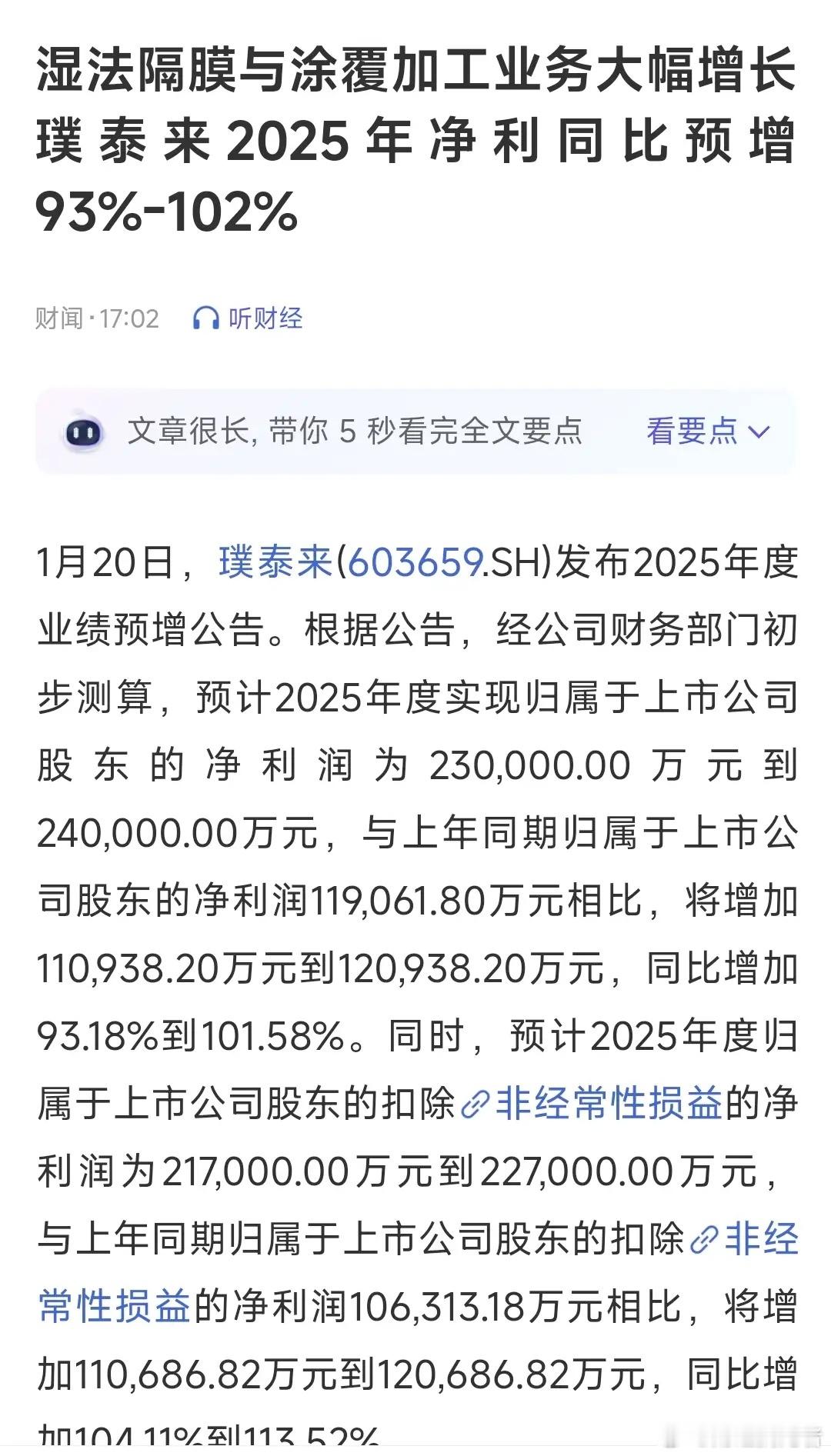 锂电池材料业绩一个个都不错哇,这次是隔膜+负极材料!!!近日,锂电池材料陆续公布了2025年财报预告,整体来看都是大幅提升的,尤其是第四季度单季度盈利能力明显增强。刚刚璞泰来也公布了自己的2025年年报预告,受隔膜材料业务大增业绩提升明显,全面净利润23亿元~24亿元,其中第四季度单季度净利润6亿元~7亿元同比大幅提升!