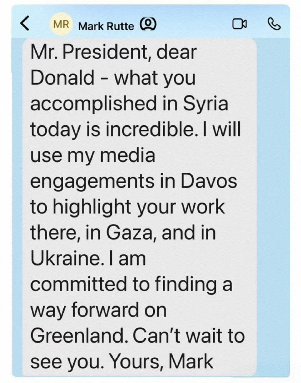 吕特给Daddy的信: 亲爱的Donald,你在叙利亚问题,做得太棒了!我会在达沃斯帮你宣传,还有加沙、乌克兰,你的成就,我都会提……格陵兰问题,我一定会找到办法的。本周的达沃斯论坛又有大戏开演,本次轮番上场的是北约内部各位“大佬”。不管戏怎么表演,格陵兰岛的命运基本已经定了—不属于丹麦。丹麦如果确实要解这个死结,可以寻求第三方合作,让第三方在岛上驻军,驻军数量一定要超过美军,并且这个第三方一定是个军事强国才行。放眼看一圈,找大鹅吧!