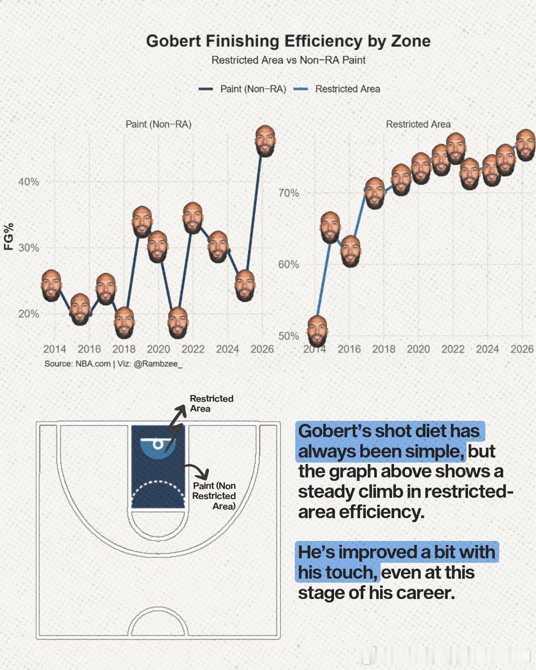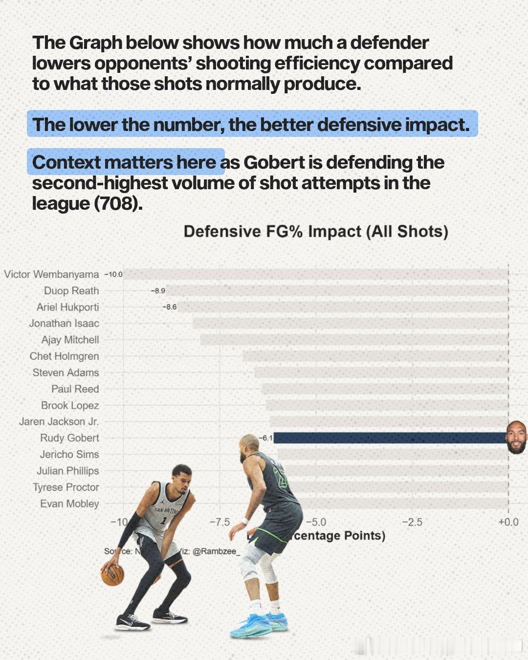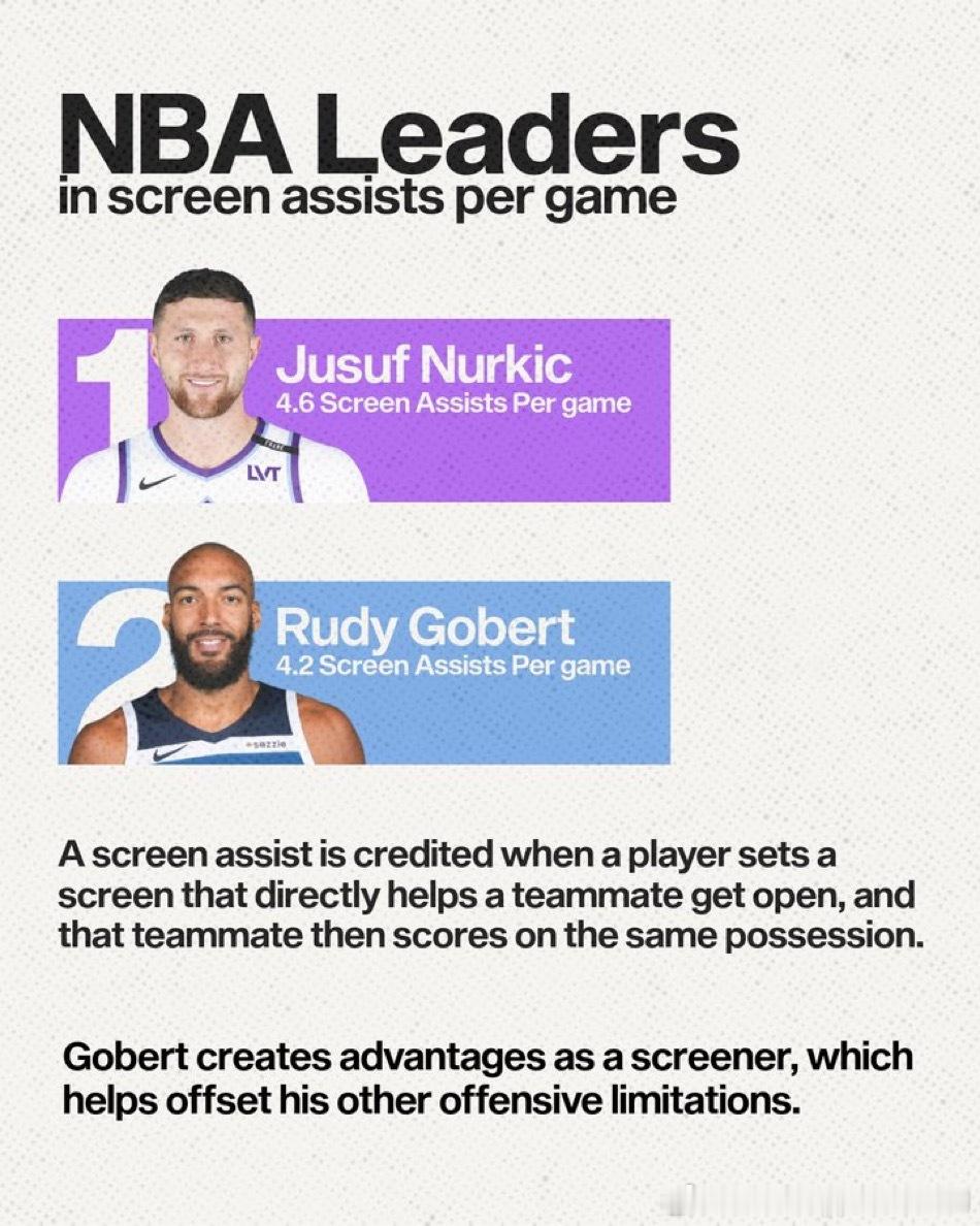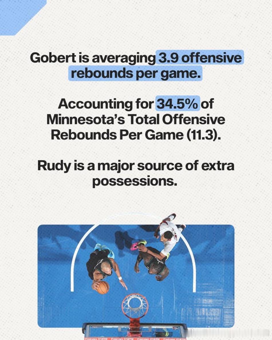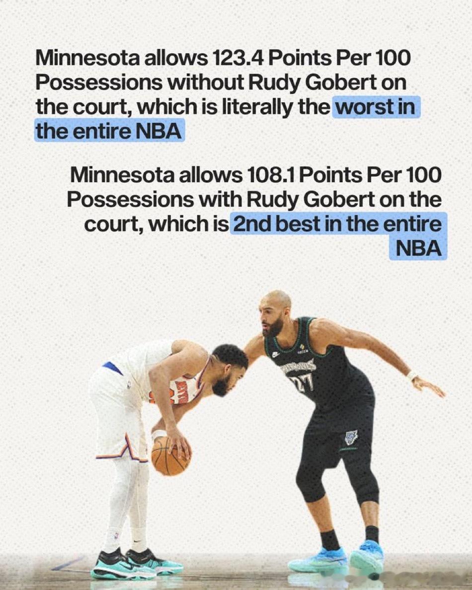 【本赛季森林狼战绩提升,戈贝尔的作用功不可没】【进攻端的贡献】1. 进攻篮板与二次进攻:场均3.9个进攻篮板,占全队(11.3个)的34.5%。他是森林狼队内极其重要的额外进攻机会创造者。2. 终结效率的稳步提升:禁区(Restricted Area) 的命中率随职业生涯呈现稳定上升趋势,即使在职业生涯后期仍在改善。非禁区油漆区(Non-RA Paint) 的命中率保持稳定。他的终结手段虽然简单(主要集中在篮下),但本赛季效率极高且仍在进步,是极其可靠的高效终结点。3. 掩护(挡拆)价值:场均4.2次“掩护助攻(Screen Assist)”,高居联盟第二。他通过高质量的掩护为队友创造直接得分机会,这是他在进攻端除终结外最重要、最被数据化的贡献,有效弥补了其自主进攻能力的局限。【 防守端的统治力】1. 篮下护框质量:将对手在篮下的命中率限制在51.2%,在顶级护框者中名列前茅(仅次于切特·霍姆格伦的48.3%)。森林狼的防守体系特意将对手“驱赶”至他的防区,而他仍能高效完成护框任务。他是球队防守体系的基石,是联盟最顶级的篮下守护神之一。2. 全面的防守影响力:防守对手投篮的命中率影响值(Defensive FG% Impact)为-6.1%。这意味着在他防守下,对手的整体投篮命中率会比平时下降6.1个百分点。他本赛季防守了708次投篮,防守次数高居联盟第二。在承担如此巨大防守负荷的情况下,仍能保持顶级的压制效果,这使其影响力更具含金量。他的防守影响力不仅限于篮下,而是覆盖整个半场,能实质性地下调对手的进攻效率。3. 球队防守体系的绝对核心:最具说服力的数据:当他上场时,森林狼每百回合失分108.1分,高居联盟第二;当他下场时,每百回合失分飙升至123.4分,是联盟最差水平。他对球队防守的影响是现象级的。他不仅是优秀防守者,更是整个防守体系运转的轴心和保障。有他在场,森林狼是争冠级别的防守强队;没有他,球队防守立刻崩塌为联盟垫底。nba明尼苏达森林狼