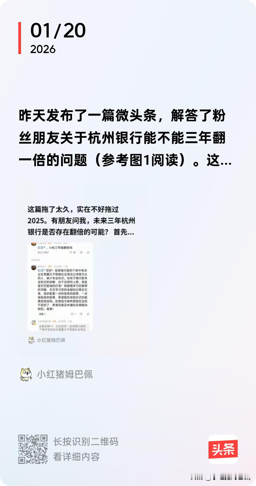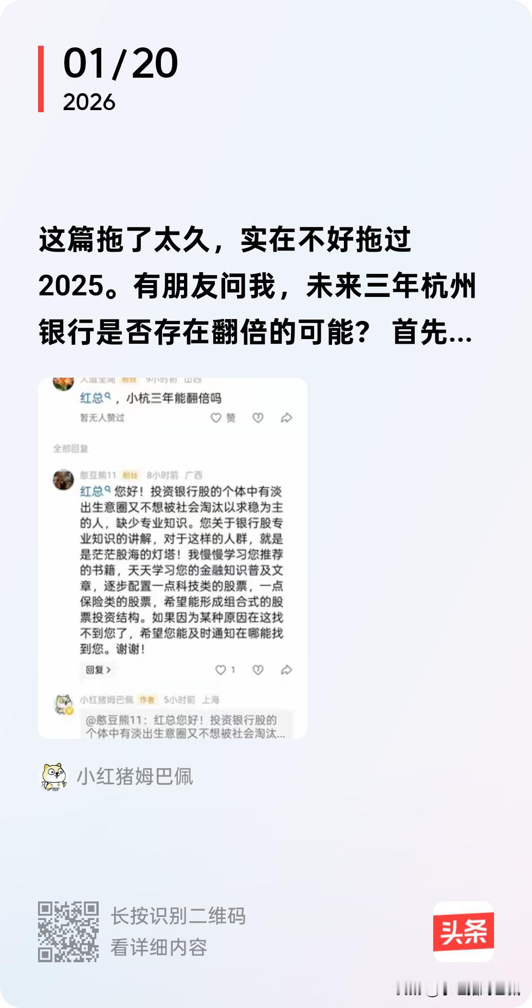 看估值不应当孤立地看,要比较地看! 两周前,我连着写了两篇头条,回应一位粉丝关于杭州银行是否三年后能够翻倍的问题,具体内容和结论大家可以参考图2和3。 今天再给大家展示一组数据:那就是2020年1月以来,银行业指数与银行业各子板块PB的走势图。其中虚线代表板块整体,4条实线分别代表了国有行、股份制、城商行和农商行。其中我们可以看到,近6年来行业整体PB从未高于过1,个别子板块例如在2021年初的股份行和城商行,整体PB曾比较接近于1。再结合此前我对杭州银行是否能三年翻倍的回答。我还是这个结论,你凭什么认为三年后杭州银行的PB一定能够在1.5倍左右?! 回到我这篇想和大家说明的道理:看估值,单纯告诉你10倍市盈率,0.8倍市净率,到底是高还是低呢?10倍就一定便宜吗?为什么未来不会变成7倍8倍呢?0.8倍市净率就一定便宜吗?市场上毕竟也有0.5、0.6倍的。所以我们看估值要做到两比一不比:与自己(历史估值)比,与同业比,不与不同行业的公司比!