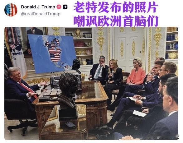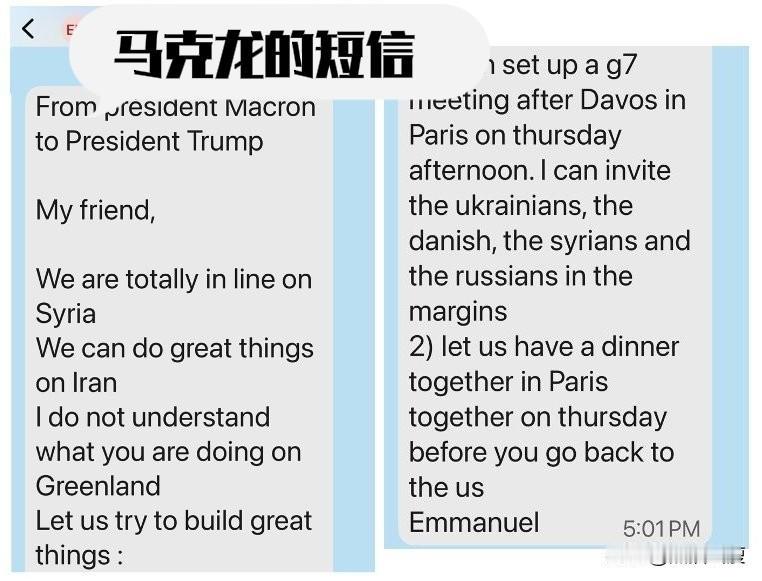 回旋镖老特开启了疯狂嘲讽欧洲首脑的模式: 又是发文字又是发照片。他不仅说英国是愚蠢至极(great stupidity),还公布了马克龙发给他的短信。 马克龙发了一大段信息给老特【哥们我不理解你这是在格陵兰岛上做什么呢?我们应该一起做更大的事,叙利亚、伊朗……让我在达沃斯后的巴黎召集一次会议吧,有俄罗斯人有叙利亚人有乌克兰人,还有丹麦人】。 将首脑间的私人沟通披露出来,曾经是马克龙对普京干过的事情。如今自己也尝到了同样的尴尬。