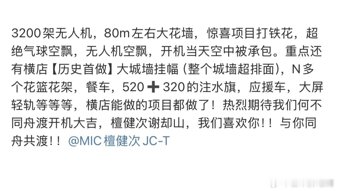 横店应援记录又更新了,檀健次《何不同舟渡》开机应援除了3200架无人机、80m花墙,还有历史首做大城墙挂幅、520+320注水旗