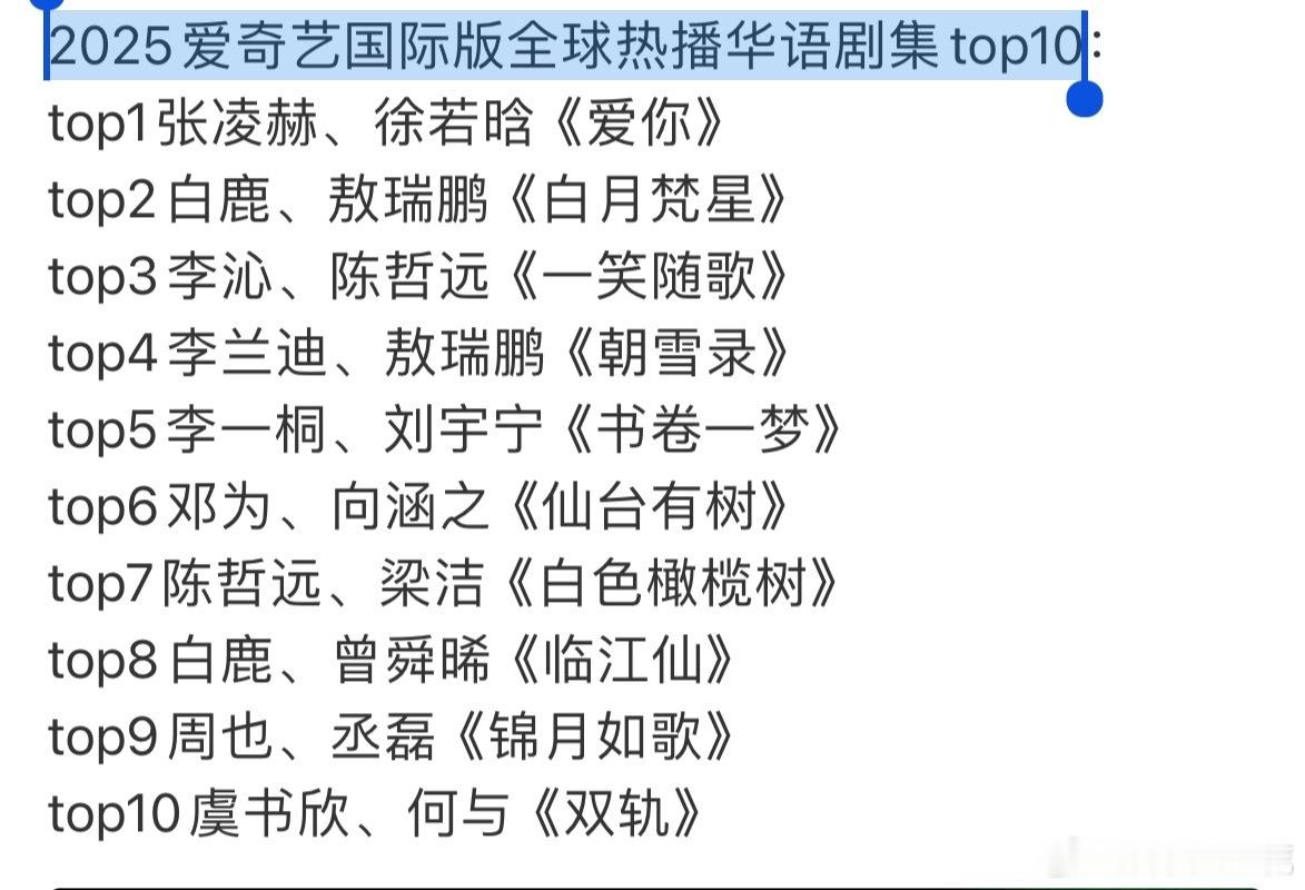 2025爱奇艺国际版热播华语剧集top10白鹿两部剧上榜热播华语剧集top10 🥝国际版热播华语剧前10 官方认证 白鹿 敖瑞鹏 陈哲远 都有两部上榜 只有白鹿两部都是大女主 其他的要么一部 要么两部但是是配角
