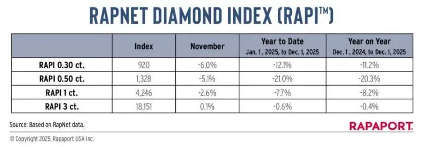 戴比尔斯此次降价,源于全球钻石市场需求下滑后带来的价格下跌。据RapNet钻石价格指数(RAPI)显示,2025年,3克拉以上钻石RAPI微跌0.4%;0.3-0.5克拉等小颗粒日常消费级钻石,受培育钻石冲击和需求疲软影响,价格跌幅显著,2025年0.5克拉钻石全年跌幅超过20%。