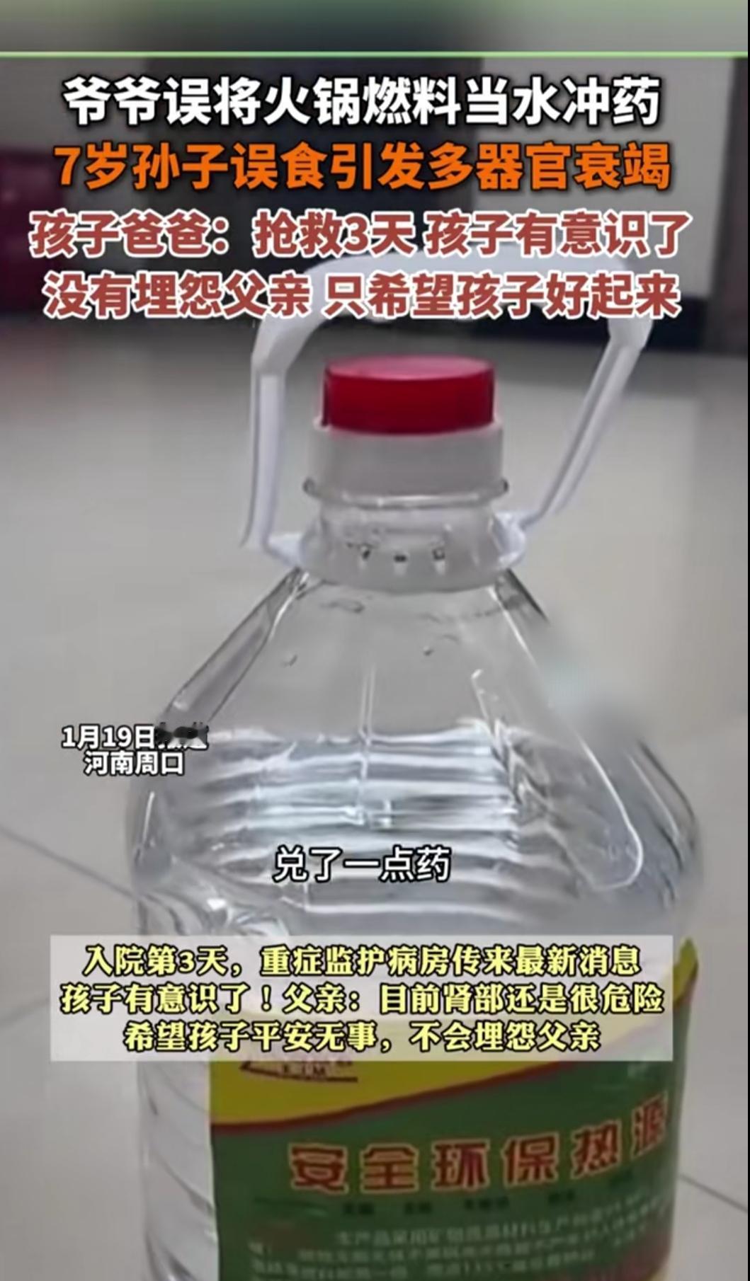 谁能想到,爷爷满怀疼爱的一次喂食,竟成了孩子的噩梦。误将燃料当作清水喂给孙子,短短时间内,孩子就因多器官衰竭陷入昏迷,紧急住进ICU。这份沉甸甸的爱里,藏着长辈对危险品的认知盲区,没有恶意,却差点造成无法挽回的伤害,让人既心疼孩子,又不忍苛责老人。 看着病床上插满管子的孩子,听着家长崩溃的倾诉,每个为人父母、为人子女的人都感同身受。生活中,这样的“隐形杀手”其实无处不在:没贴标签的清洁剂、随意摆放的农药、混放的酒精与打火机,长辈们习惯了旧时代的生活逻辑,往往意识不到这些日常物品的致命风险。 这场悲剧给所有家庭敲响了安全警钟。多花点时间给长辈科普危险品知识,家里的危险物品务必贴好醒目标签、单独密封存放,不让孩子轻易接触。爱需要细心守护,别让一时的疏忽,让原本的疼爱变成一辈子的遗憾,愿每个孩子都能在安全的环境里健康成长。