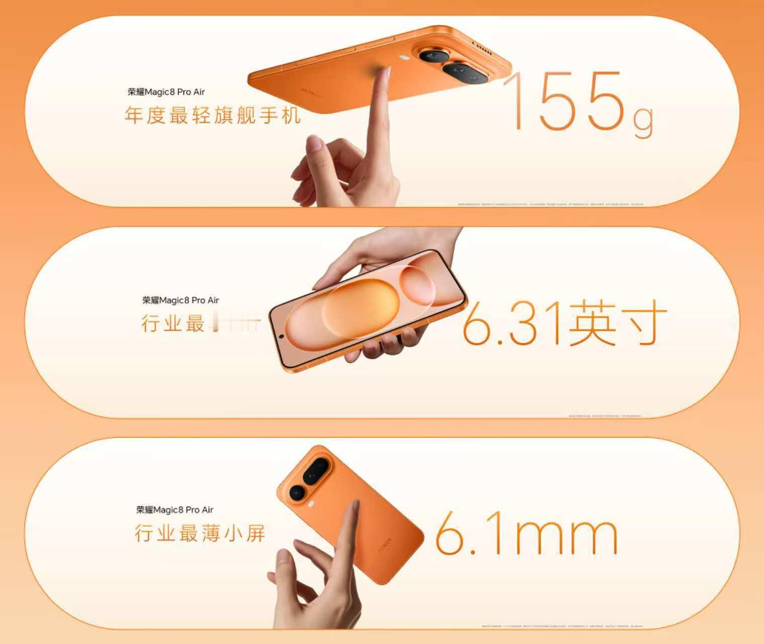 昨晚荣耀发布会 再次摸到荣耀Magic8 Pro Air真机,155g重量+6.1mm厚度,揣兜里几乎无感!但续航一点没缩水——5500mAh电池撑足一天重度使用,轻薄和续航这次真的兼得了。现场踢踏舞狂踩手机测试,机身毫发无损,这可靠性我服!还有必须要说的一点就是,4499元的价格,对于一个既想要Pro级配置,又想要Air机身的朋友来说,不冲等什么?