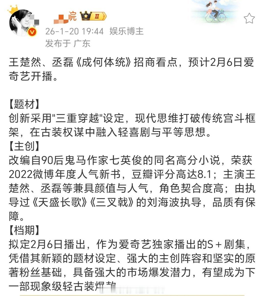 王楚然 丞磊《成何体统》招商看点🈶2月6日爱奇艺开播!大家看不看??