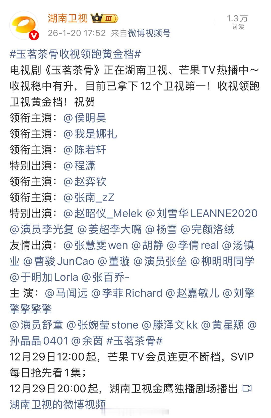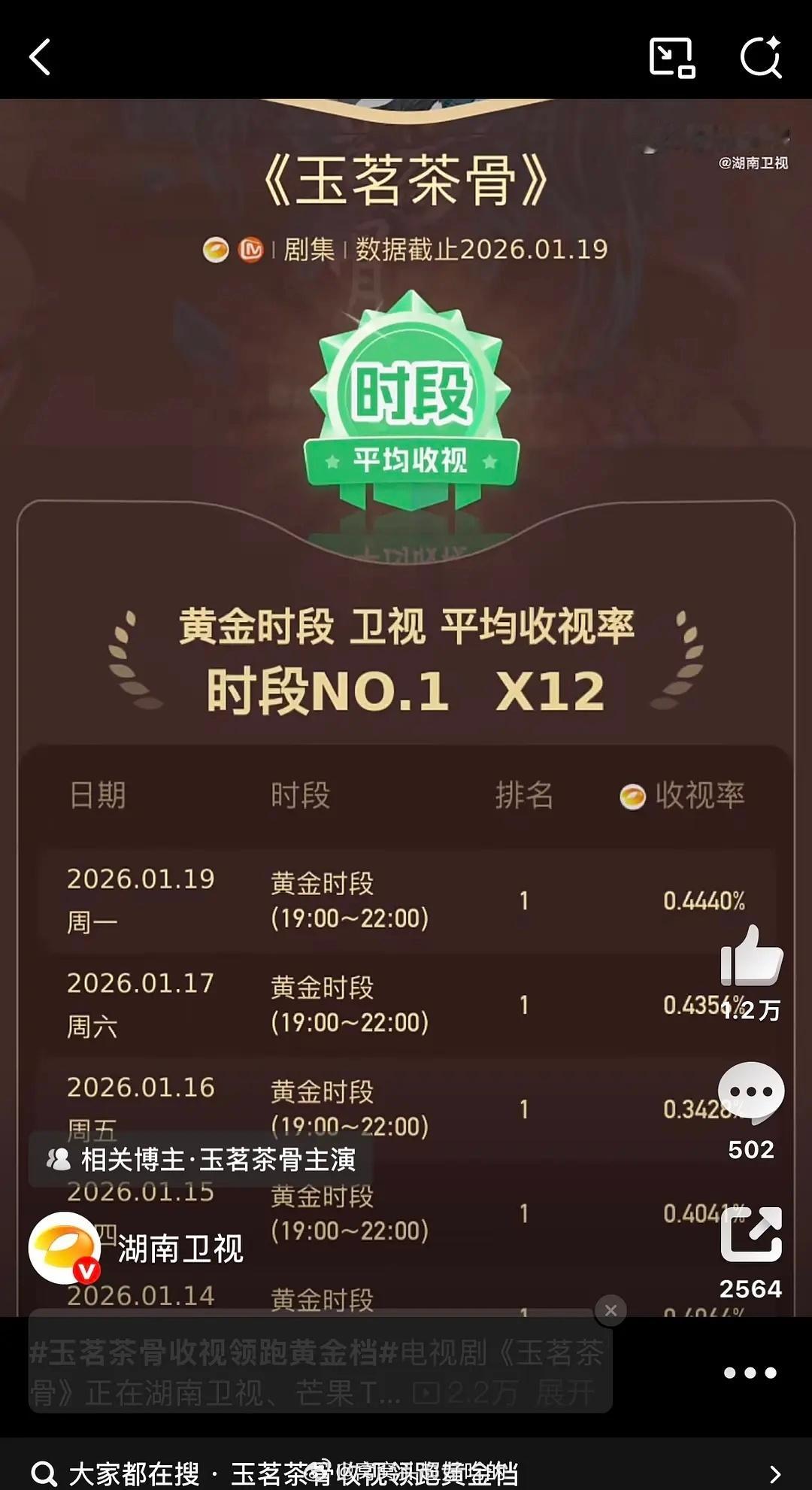玉茗茶骨收视领跑黄金档侯明昊又收获了一番实绩拿下12个卫视第一!收视领跑卫视黄金档玉茗茶骨湖南卫视播的好啊,开年红啊!上个剧大结局市占率从0.785%拉升到1.40%只能说一句牛!