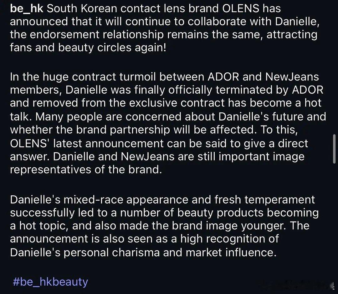丹尼尔离开组合后的第一个代言来啦OLENS隐形眼镜今天宣布和丹尼尔单独签订广告合约,丹尼尔继续担任其全球品牌大使,并由新的管理团队管理。