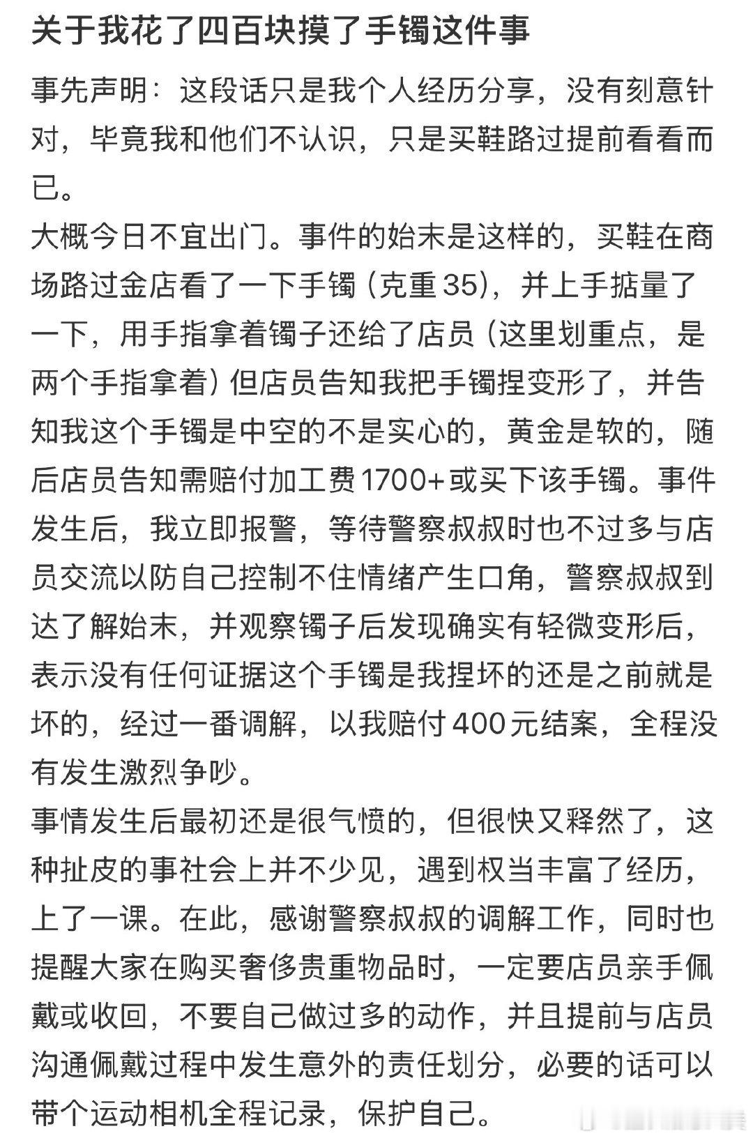 花费四百元购买了手镯。