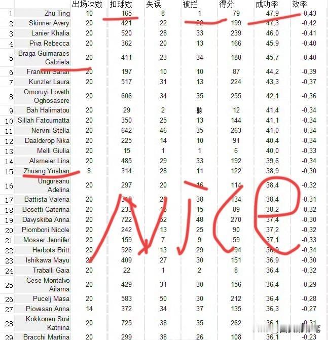 意甲主攻排名揭晓,朱婷双第一,其中一数据更惊艳[赞] 瞧,榜单,且不说她进攻成功率和效率第一,远超加比,单单失误数量有且只有一个,这手感,真是控制到极限了,无人能比。 看,训练场的朱婷,永远都是专注地接一传,训练刻苦,比赛优秀的朱婷,真是YYDS。一起为国际主点赞👍